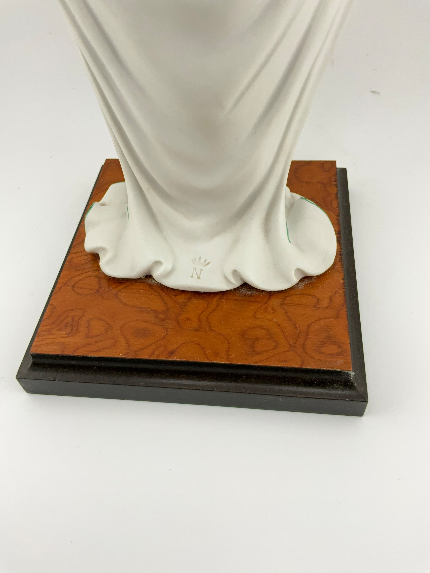 Add a touch of elegance to your decor with this beautiful Vittorio Sabadin Capodimonte Porcelain Figurine. The stunning Art Deco design features a woman in a floral print gown, light blue hat, red fingernails and gold accents throughout. The figurine is fixed to a square wooden base with a gold plate signed: Vittorio Sabadin. This rare piece was crafted in Italy around 1988. The figurine measures 14.5 inches in height and 7 inches in width. The wooden base measures 4.75 inches x 4.75 inches. The intricate details and exquisite design make it a wonderful decorative collectible for all occasions. Don't miss your chance to own this unique piece of art.