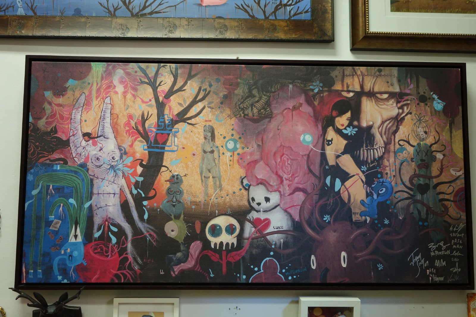 art jam piece painted by some of the leading artist in the pop surrealism scene including James Jean, Tara McPherson, Tim Biskup, Gary Baseman, Luke Chueh, Lola, Frank Kozik, Ragnar, Gris Grimley, Amanda Visell, Jeff Soto & Jeffrey Scott.