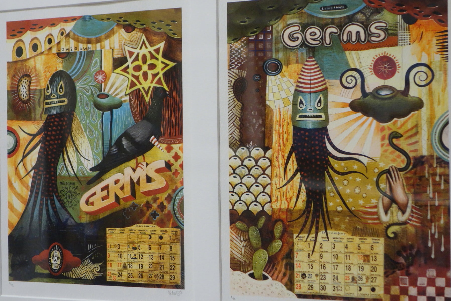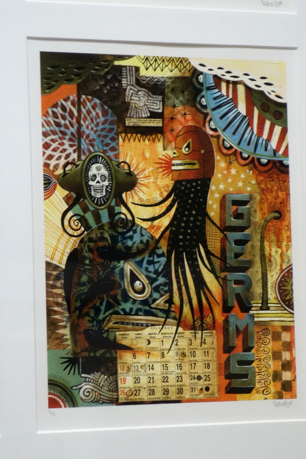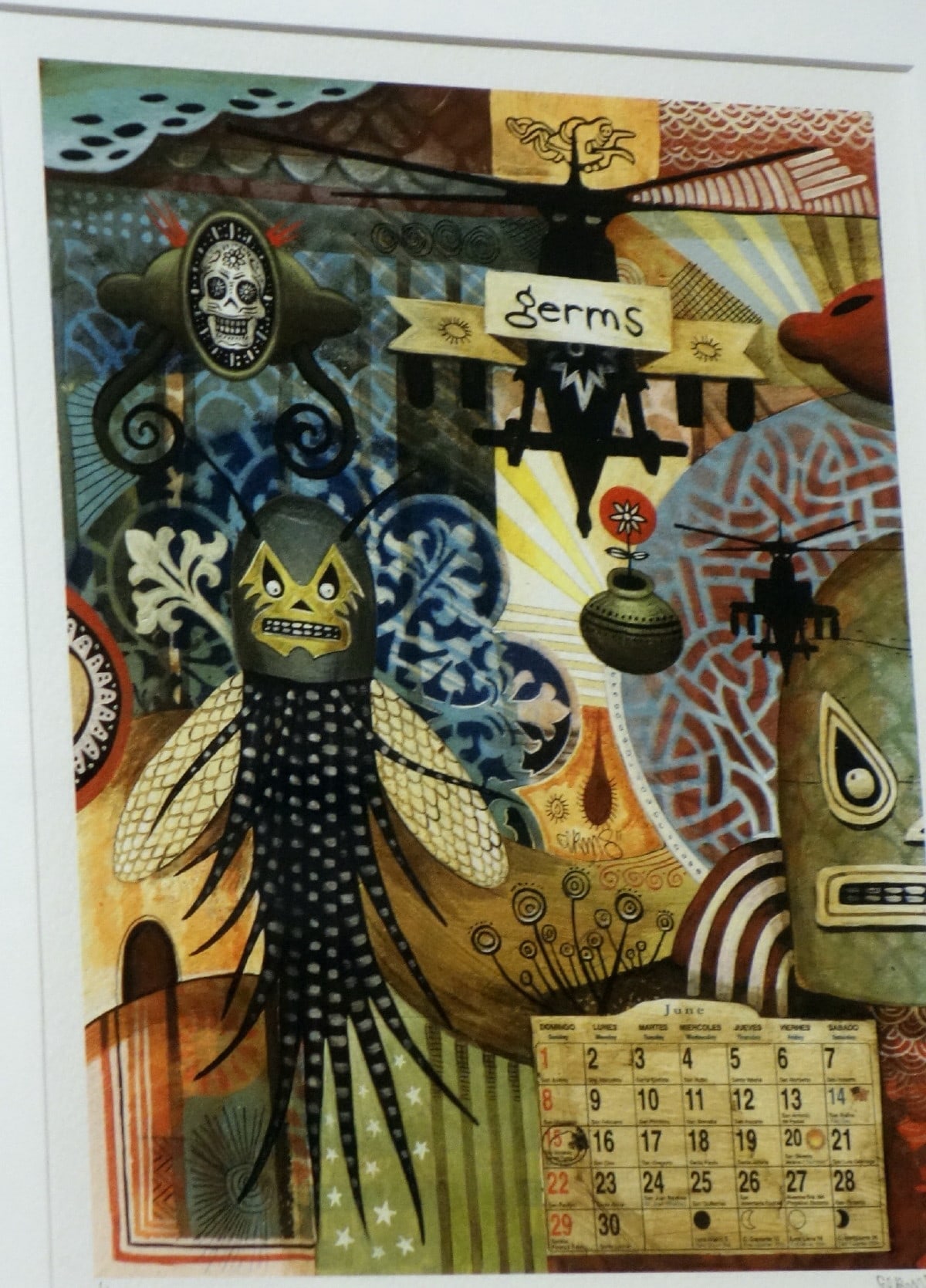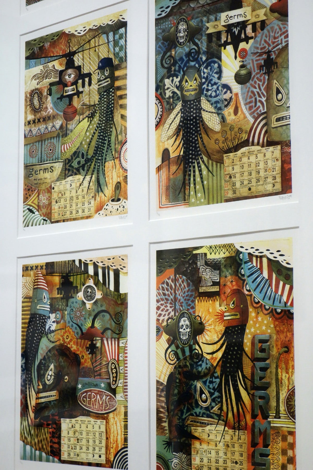 South Los Angeles native Jaime Zacarias aka GERMS is seemingly infected with an innate ability to channel the spirits of our surrealist predecessors, slapping our eyeballs with his grotesque yet amusing iconography and ameoba like characters while simultaneously referencing post-Chicano culture and imagery. He is known for cleverly stylized Luchador masks given life by their protruding tentacles, surrounded by floating amoebas that playfully flirt with their viewers' imaginations.
