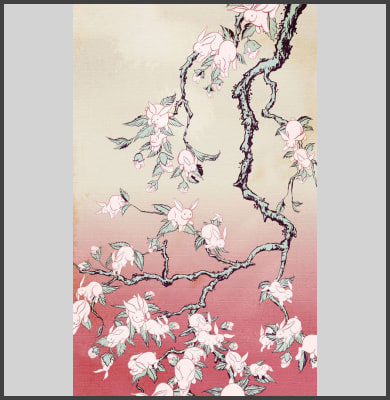 The recurring theme of bunnies in Kozyndan's work appears again here in the tree that is slowly bursting into a blossom but instead of flowers it's little pink bunnies.