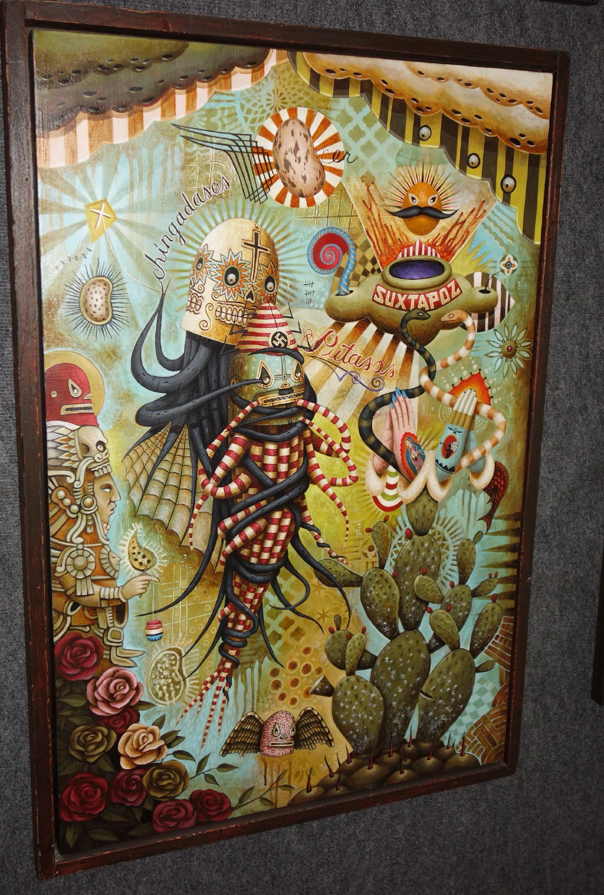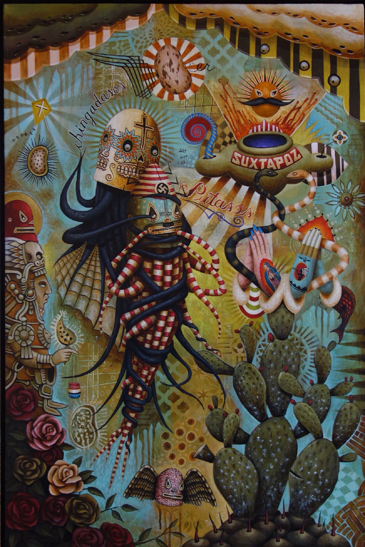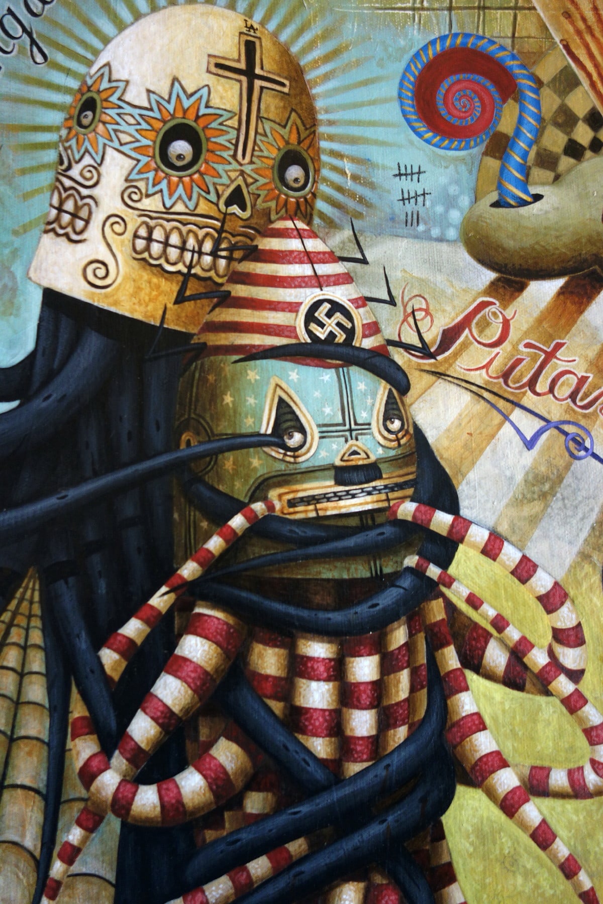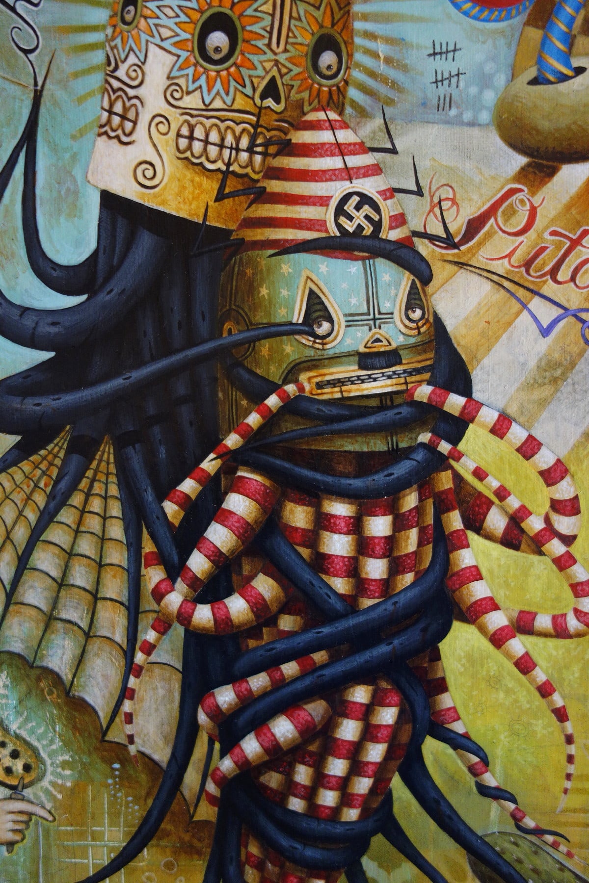 South Los Angeles native Jaime Zacarias aka GERMS is seemingly infected with an innate ability to channel the spirits of our surrealist predecessors, slapping our eyeballs with his grotesque yet amusing iconography and ameoba like characters while simultaneously referencing post-Chicano culture and imagery. He is known for cleverly stylized Luchador masks given life by their protruding tentacles, surrounded by floating amoebas that playfully flirt with their viewers' imaginations.