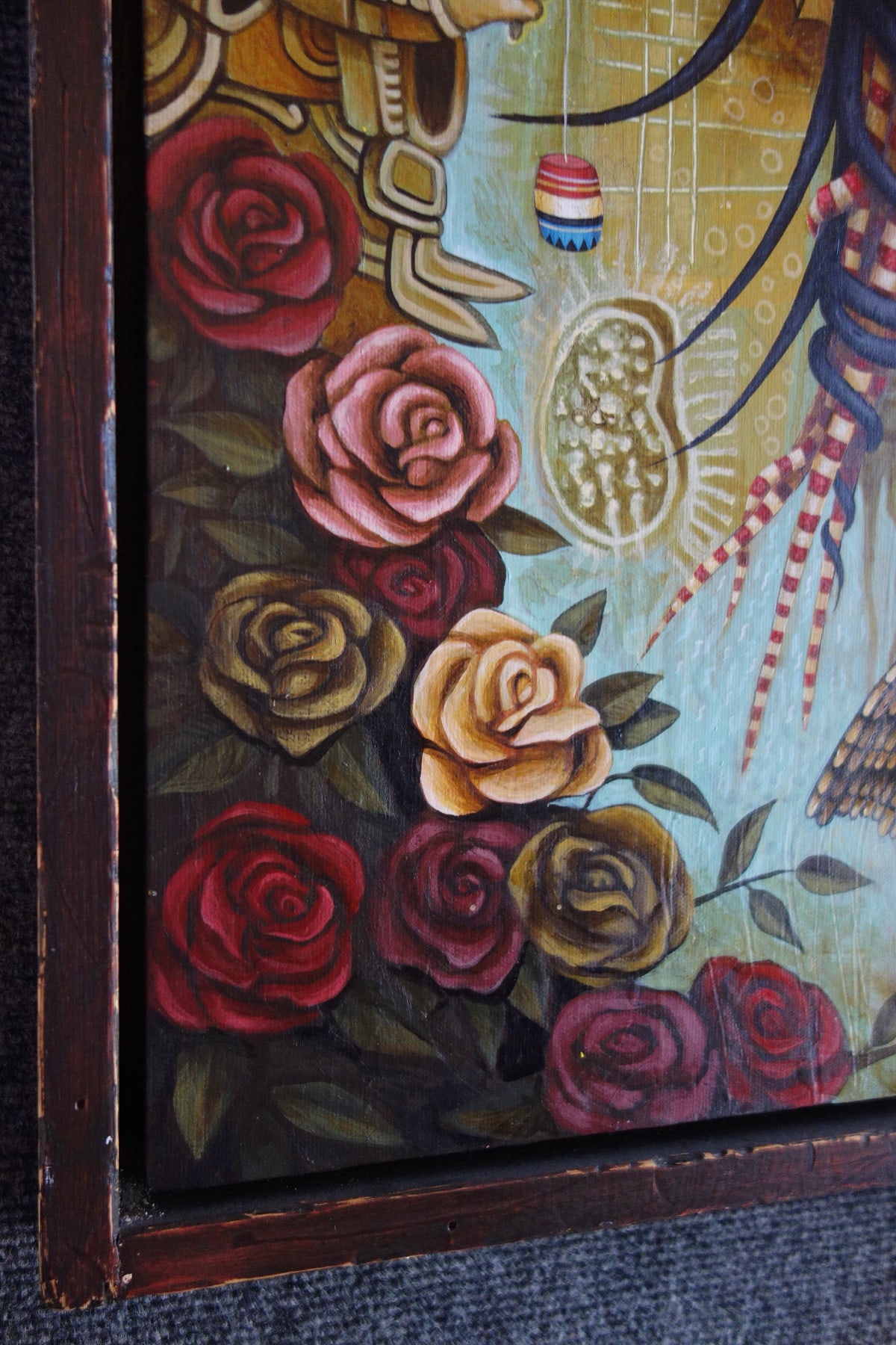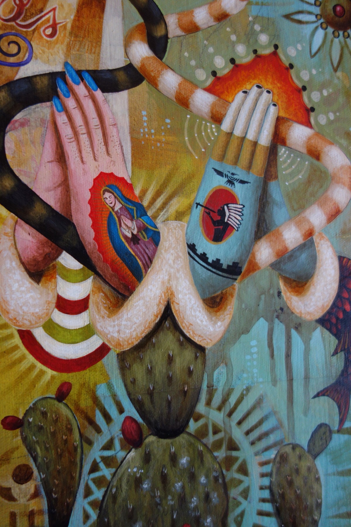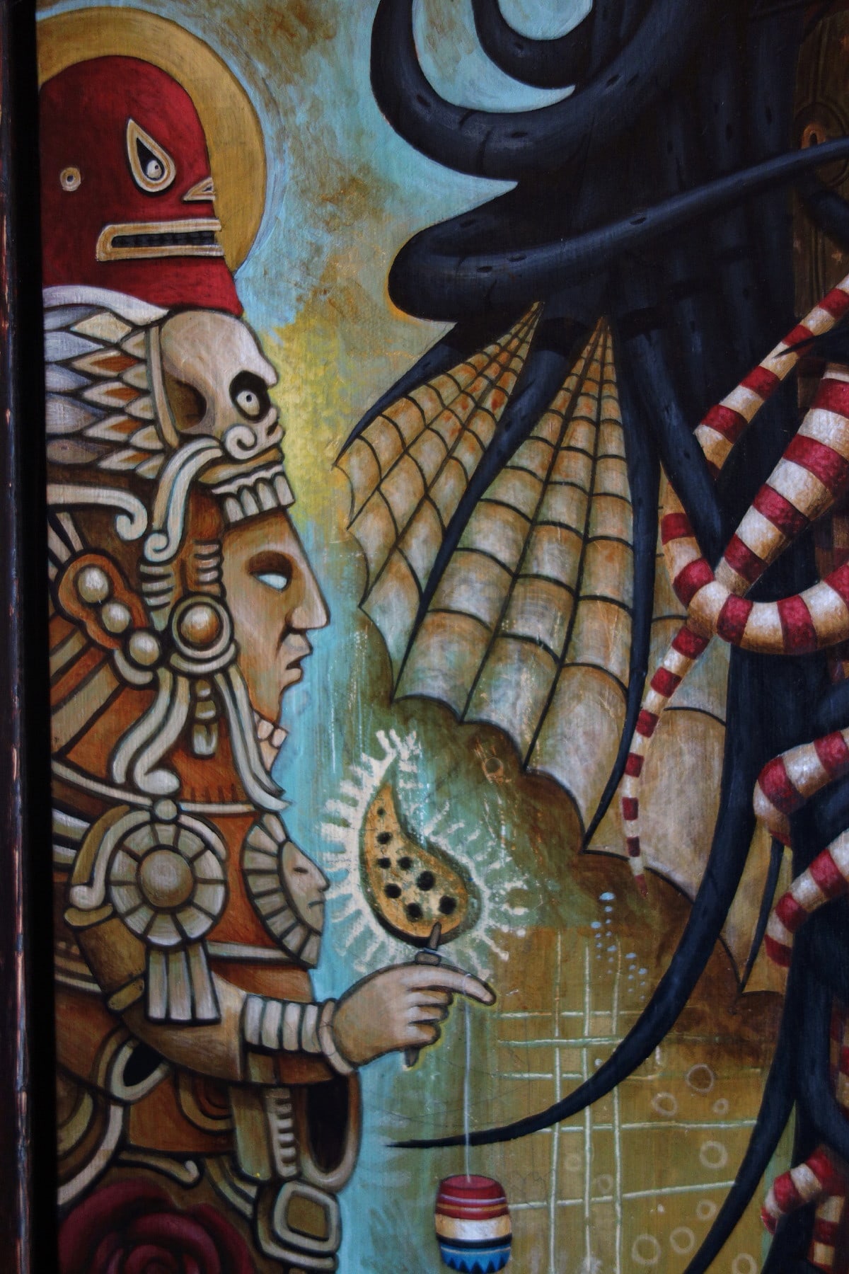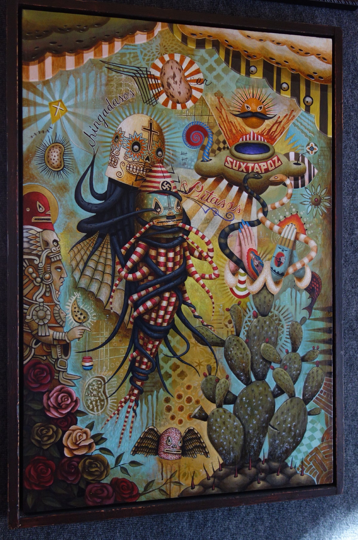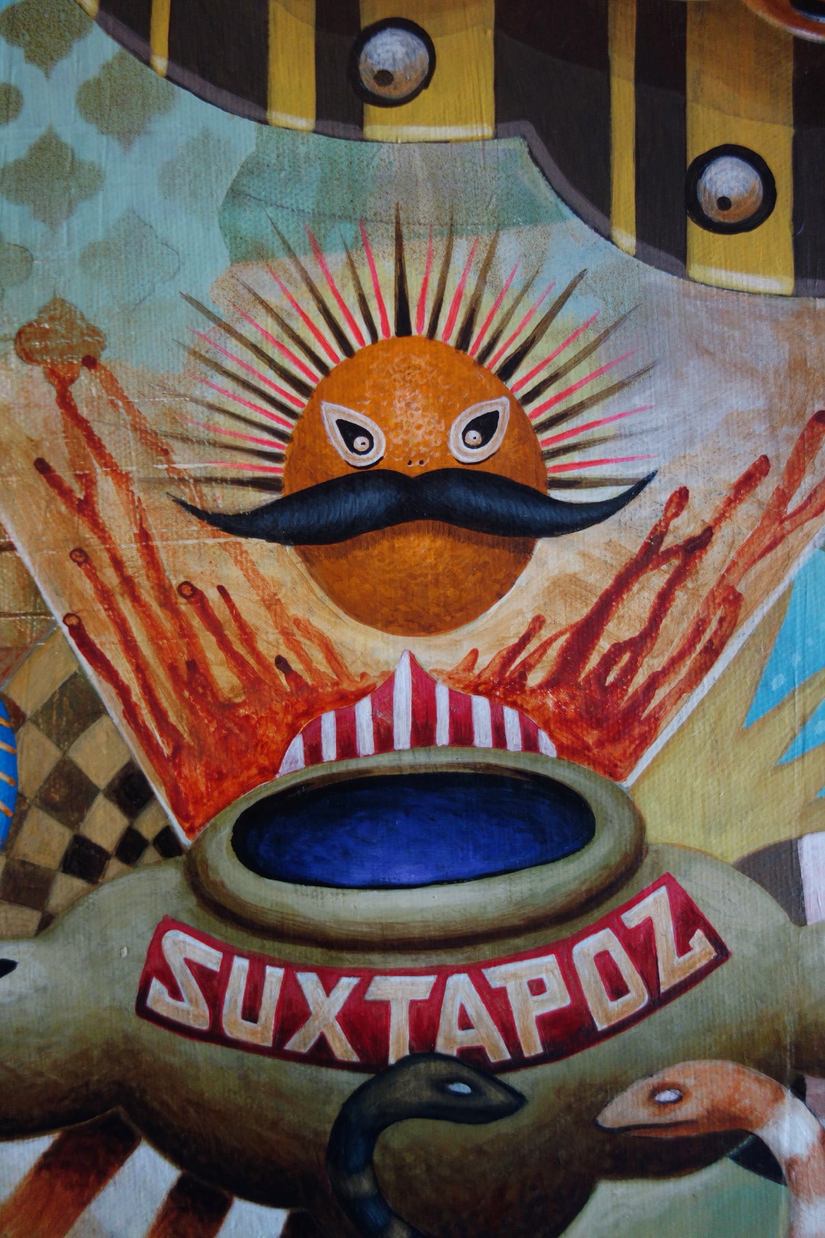 South Los Angeles native Jaime Zacarias aka GERMS is seemingly infected with an innate ability to channel the spirits of our surrealist predecessors, slapping our eyeballs with his grotesque yet amusing iconography and ameoba like characters while simultaneously referencing post-Chicano culture and imagery. He is known for cleverly stylized Luchador masks given life by their protruding tentacles, surrounded by floating amoebas that playfully flirt with their viewers' imaginations.