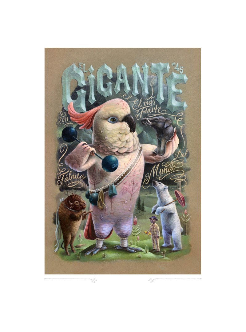 The moss green mountains near the High Hill river, the training ground of El Gigante, ‘El más fuerte cockatoo del mundo’. The background of this print is white. The image is underlined with a thin, grey line. All prints are signed and numbered.