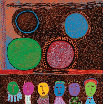 "Festival of Life" (2017) is reproduced from David Zwirner Books' new release of the same name—which comes with a pull-out poster of this very image. Essayist Jenni Sorkin cites the "ornamental urge" (a term coined by German psychiatrist and expert on visionary art Hanz Prinzhorn) in Kusama's work. "Half moons, spirals, polka dots, curlicues and circular zigzags, paisley ovoids, almond-shaped eyes, round faces, concentric circles: there is no closure, only circularity, which itself functions as both a metaphor and a fact of life—the ongoing urgency to produce repetitively. Her work lashes together such collective tropes through the resonance of circles, circling back, as it were, to the very ideas that thematize and define the human experience. Kusama emphasizes our similar circuitry: the circular logic of our minds, the roundness of our planet, and the tiny shimmering light, a pinprick (also a circle) that we make collectively, marking the universe only briefly."
