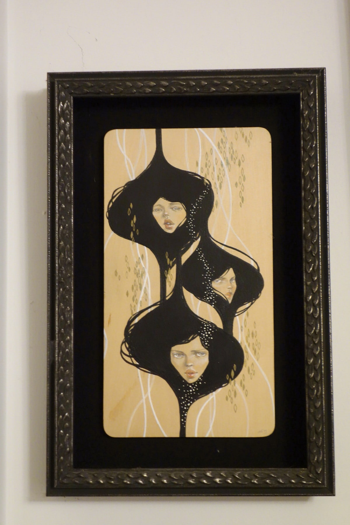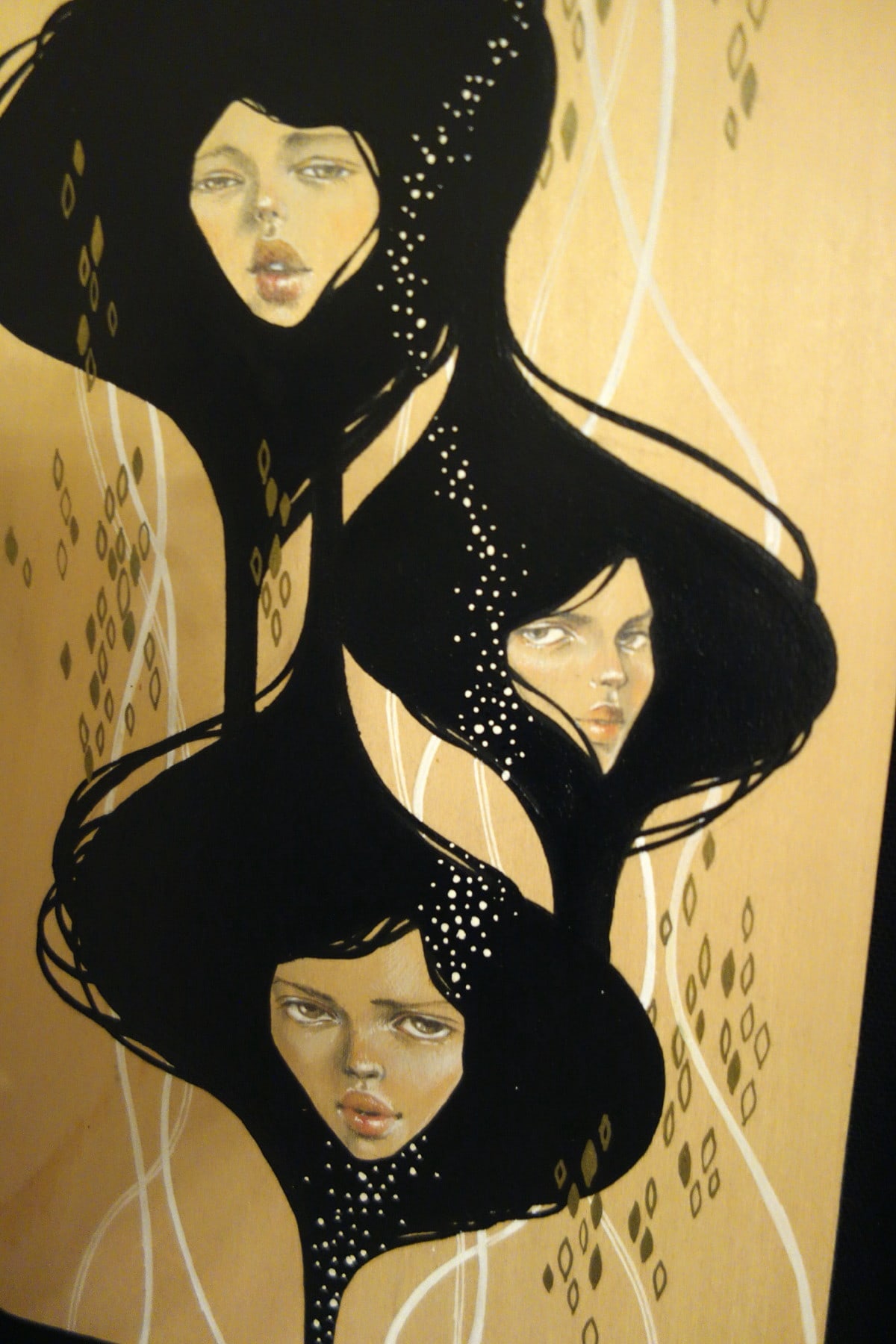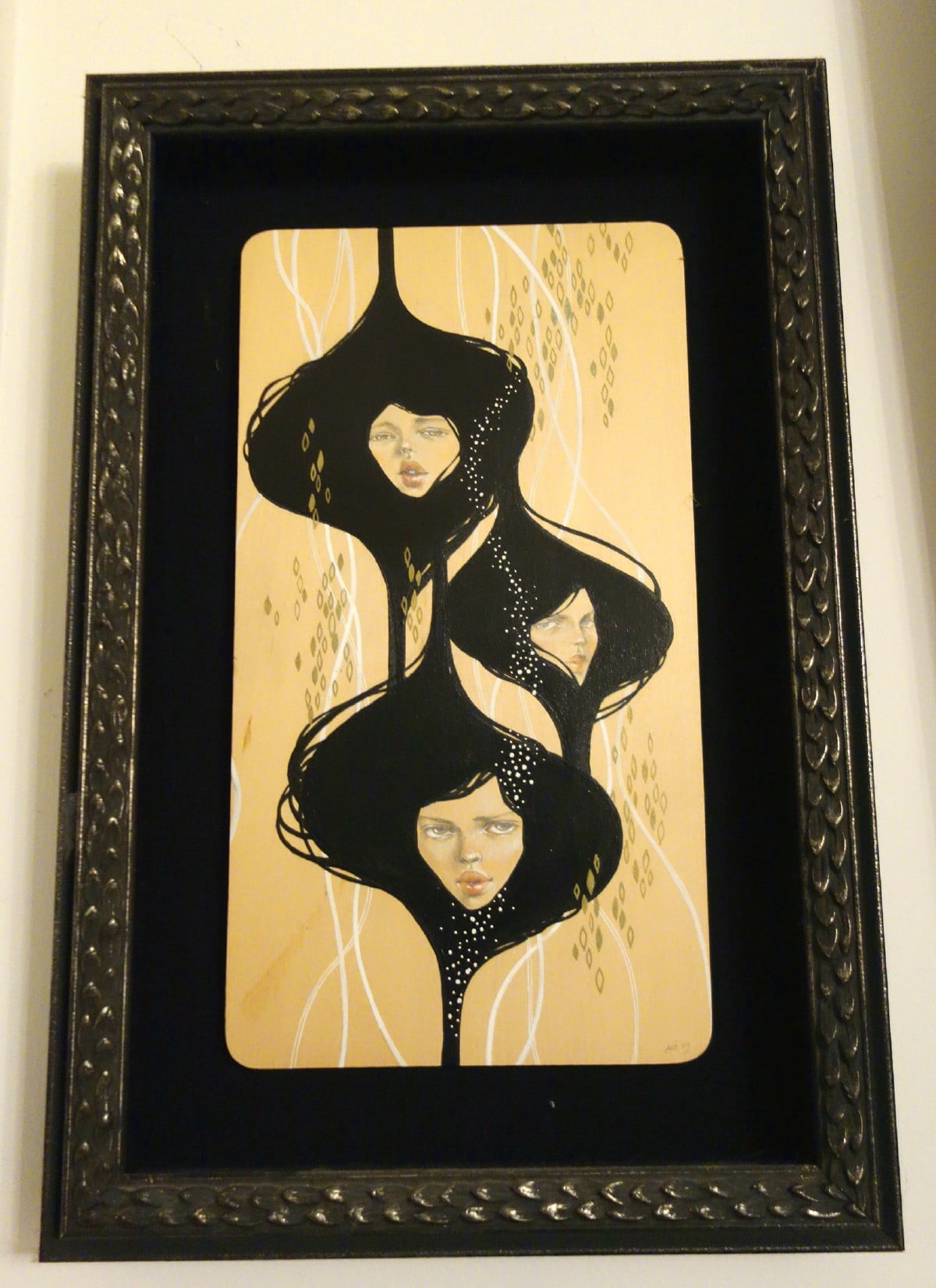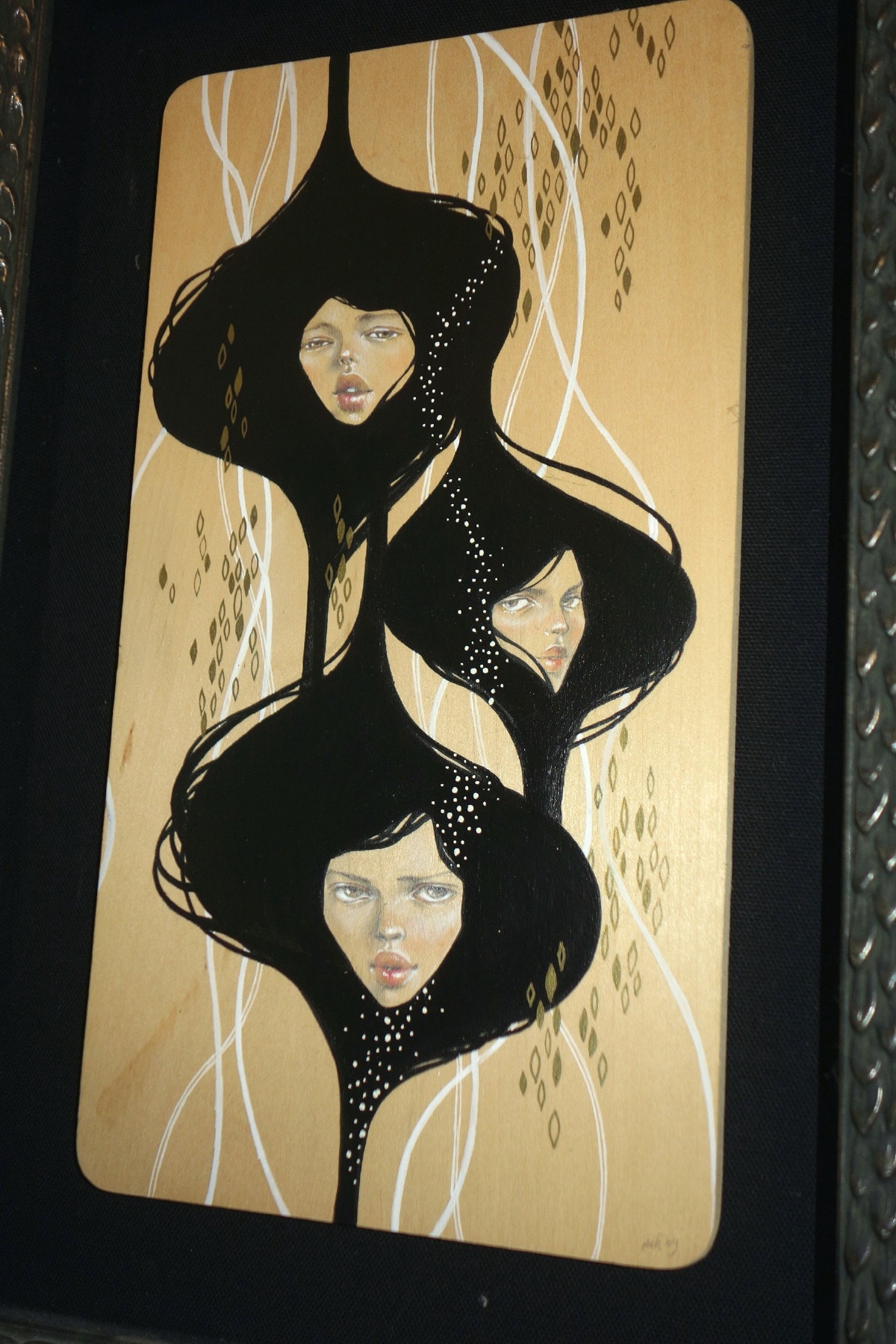 - Graphite, acrylic, metallic pen & watercolor on wood