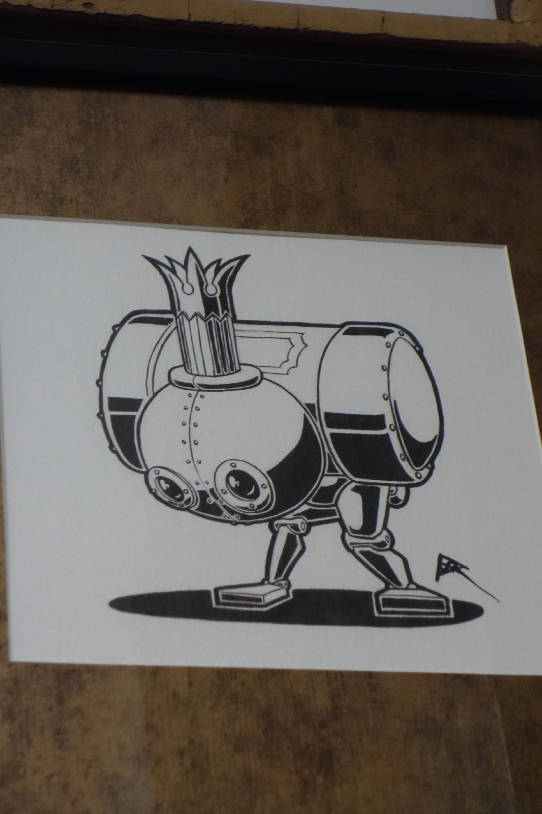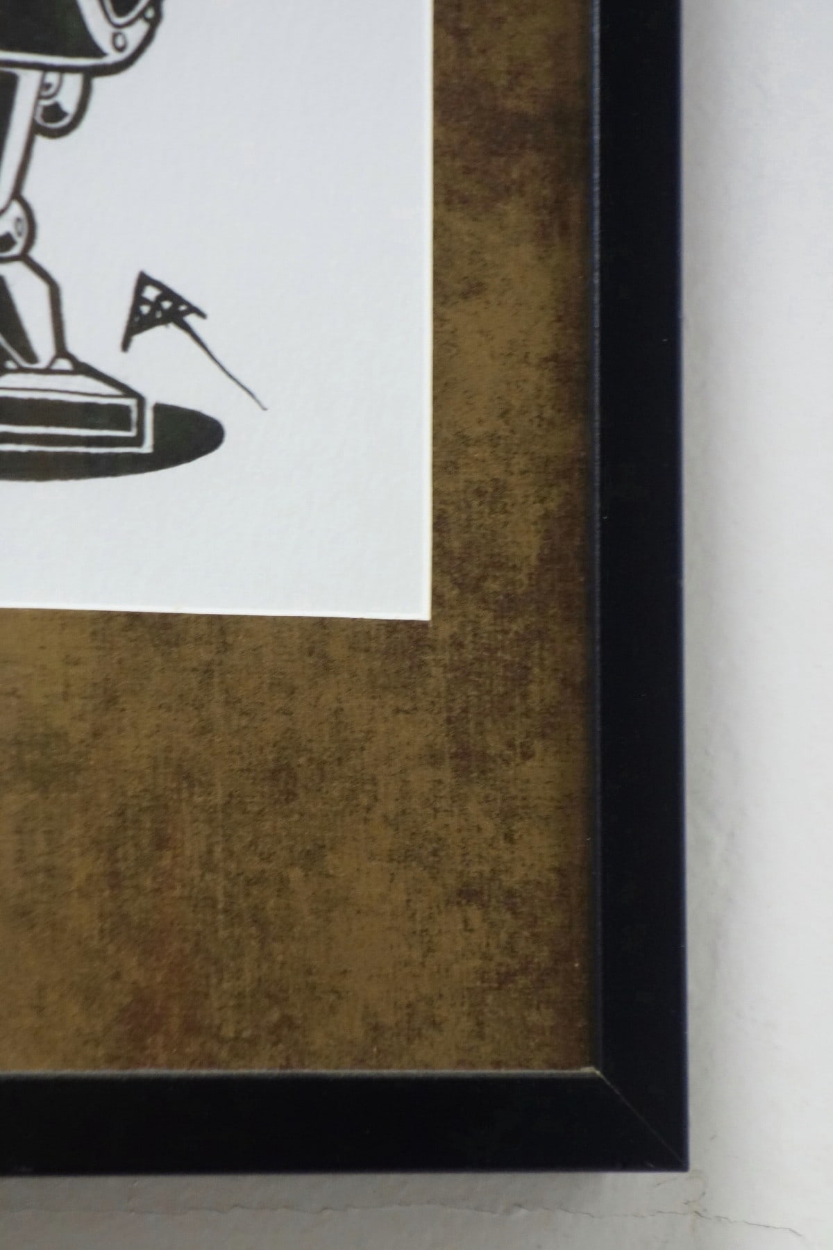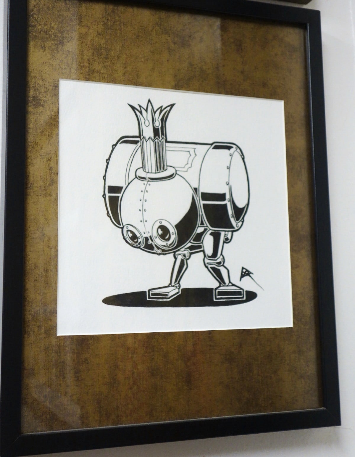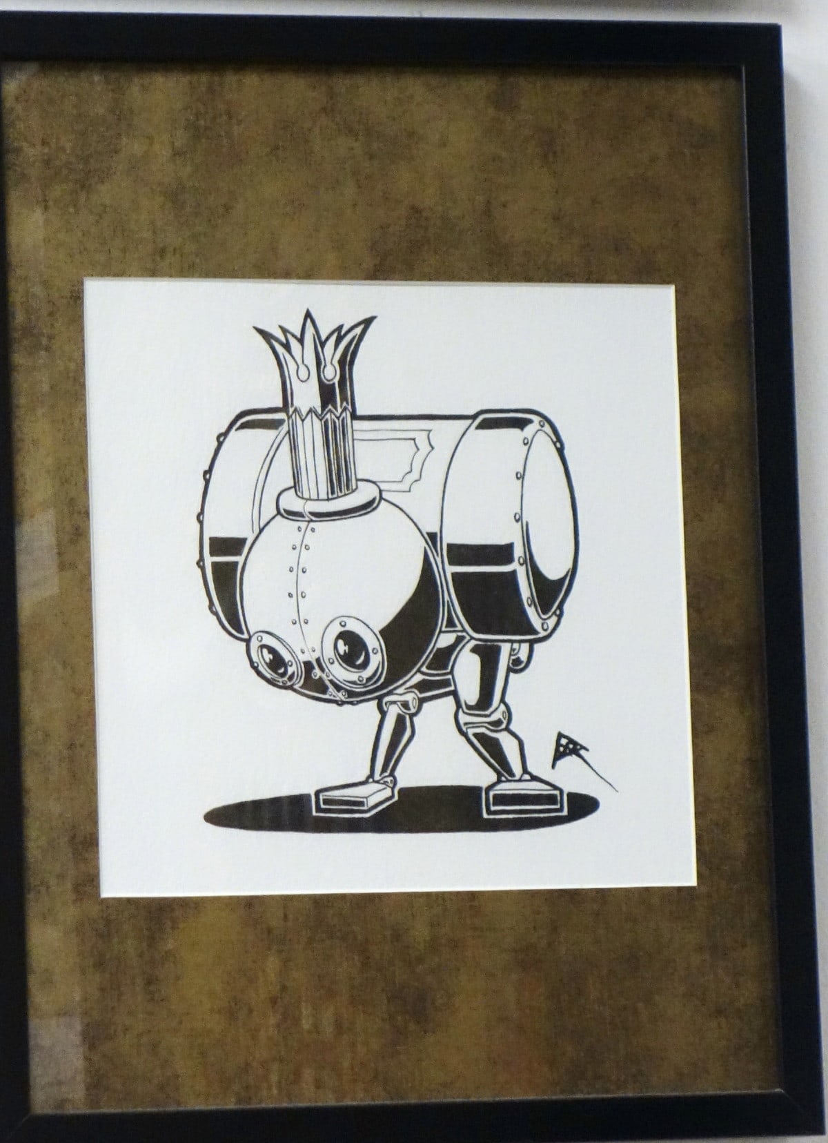 • Indian ink on acid free heavy watercolour paper, black wood frame, burnished metal bronze-plated matting