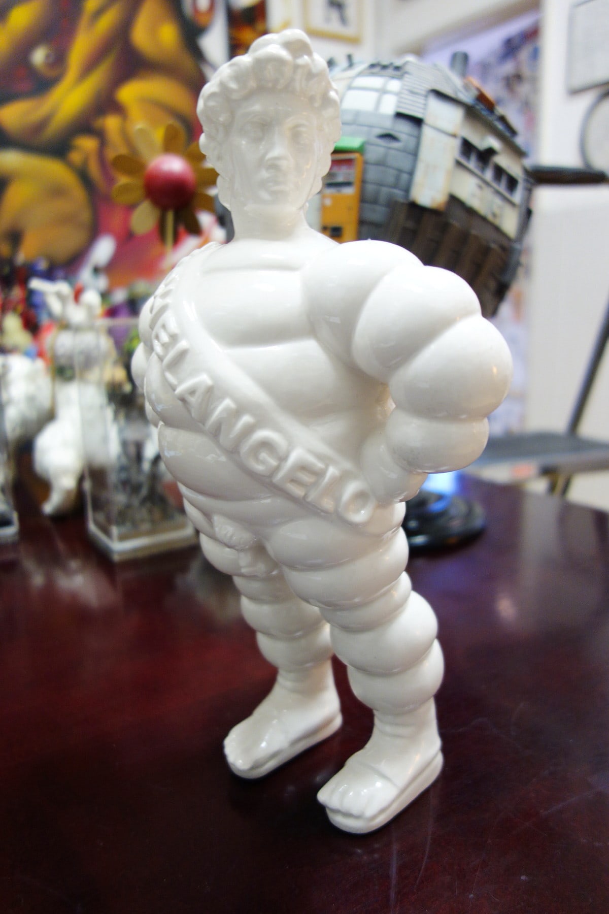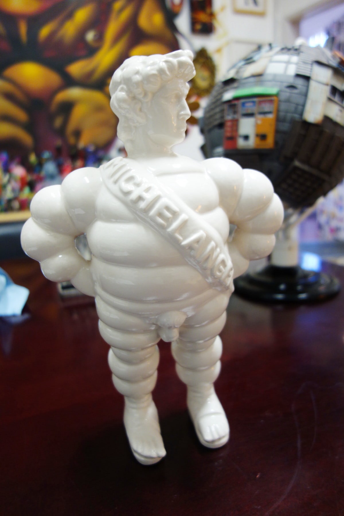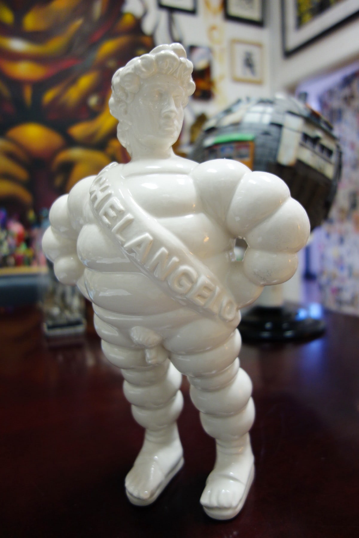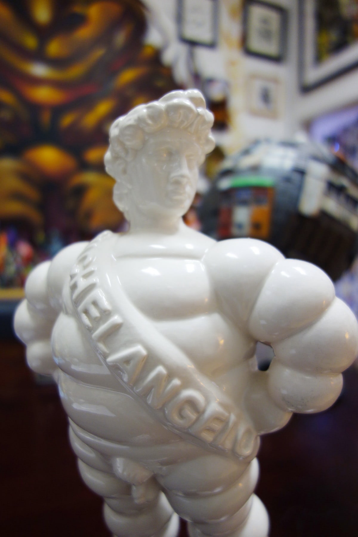 “Michelangelo” is the name engraved on the chest banner. This combines the name “Michelangelo” (the true author and sculptor of the mythical sculpture) and the name of the well known tire company, “Michelin.” This brand in fact is represented by the “bibendum,” an imaginary man-like creature made of soft circles that looks as if it was made up of car tires. It’s a symbol of our contemporary imagery, recognizable in our everyday urban life as a strong symbol of mass production, representing an established aesthetic rather than just the mere association to a single product. So Michelangelo is the David that sheds his traditional context and enters into a new suit. It exits its academic role assuming a new identity (more “pop”), becoming more reachable and accessible to the masses.