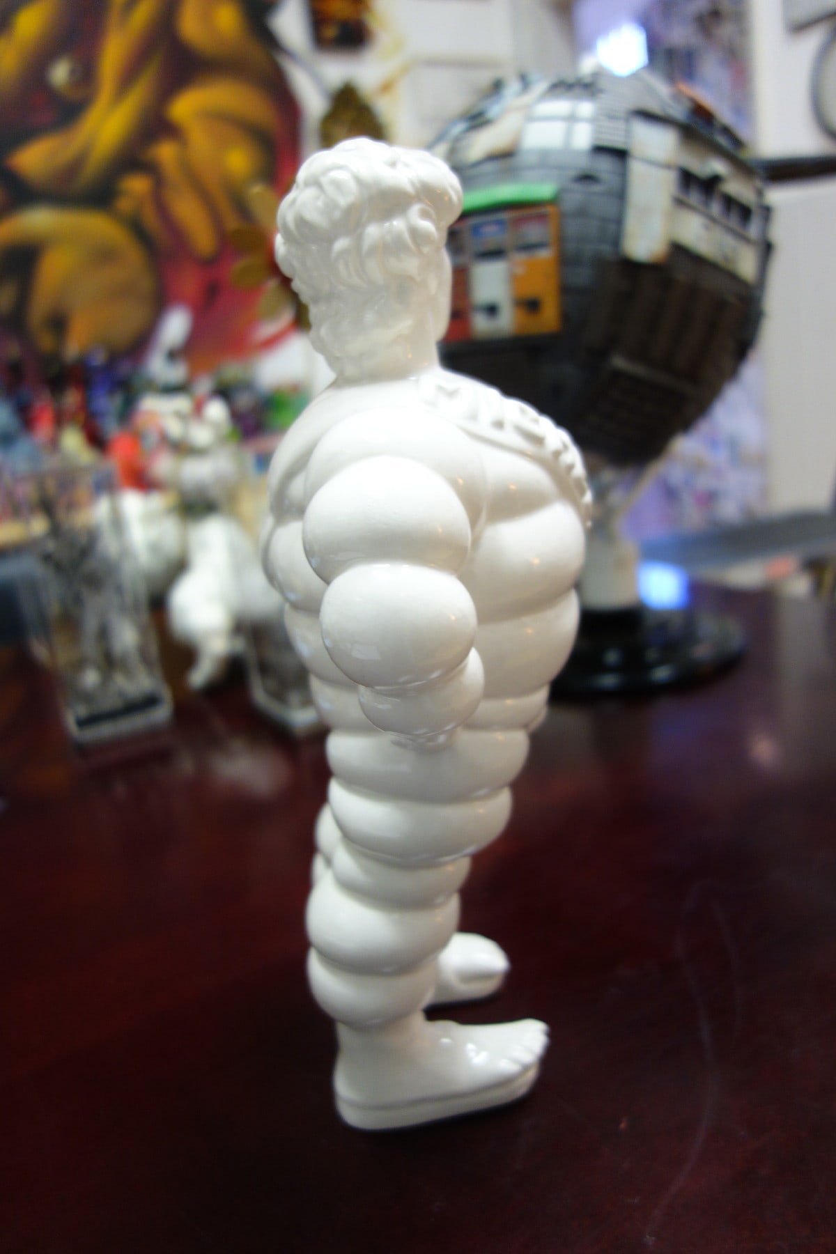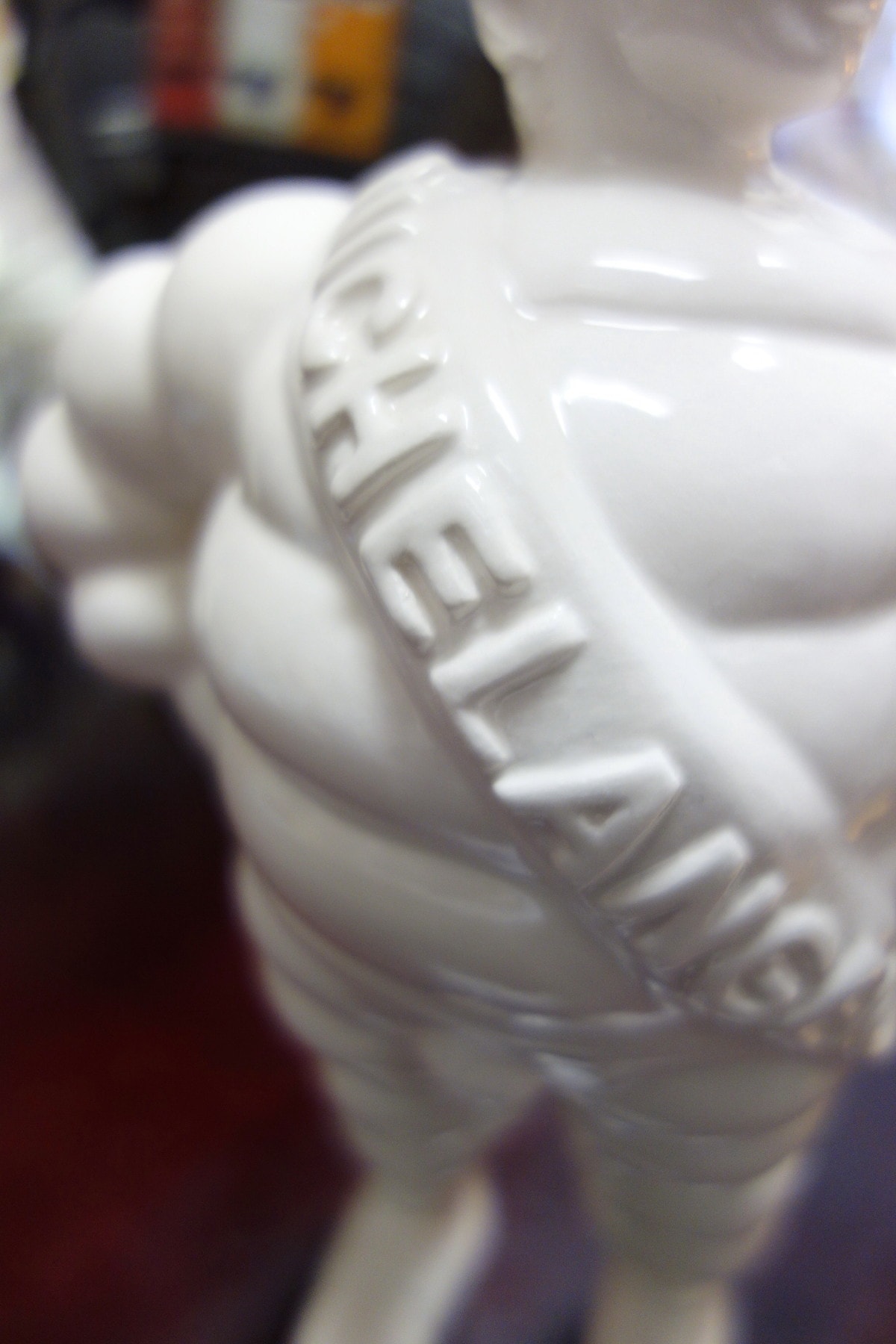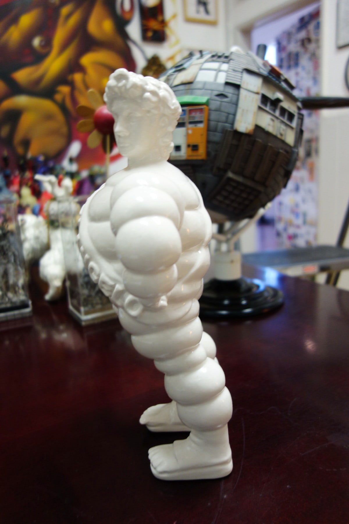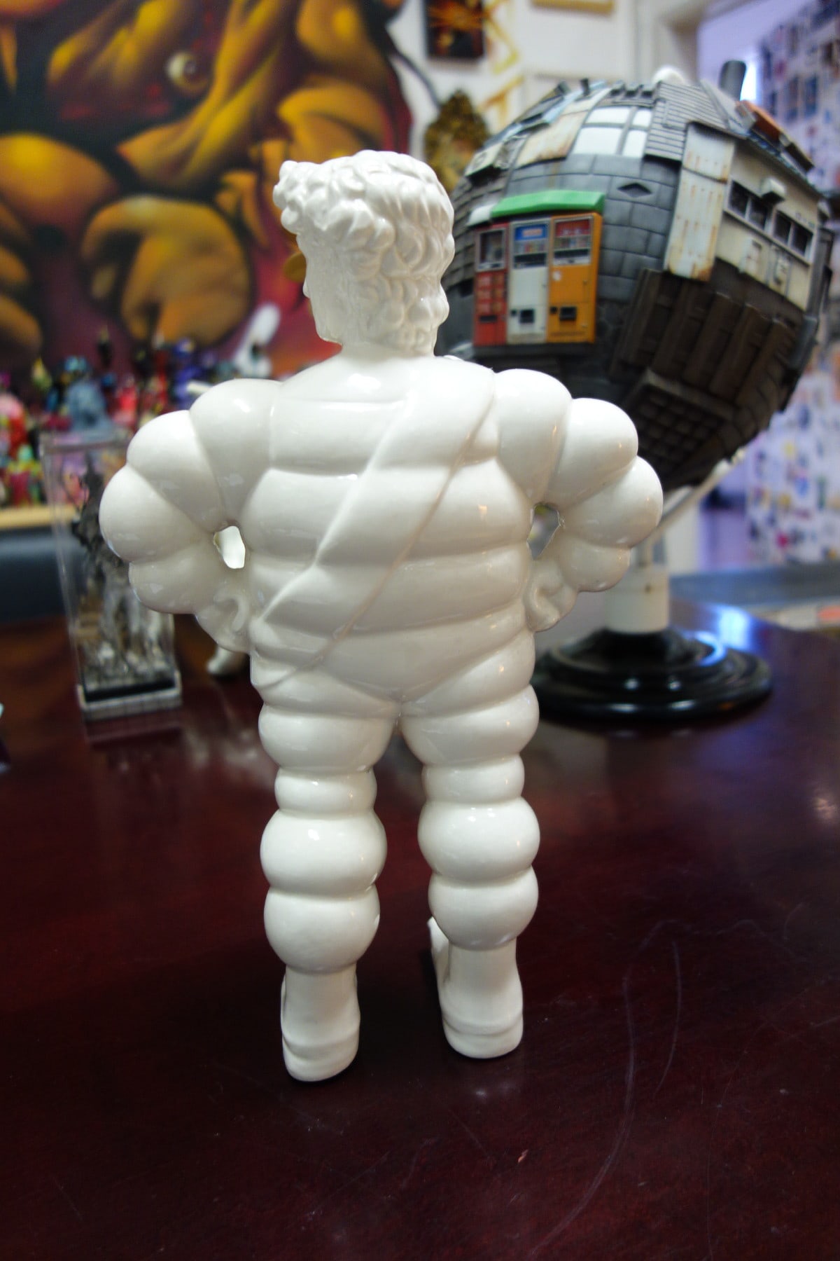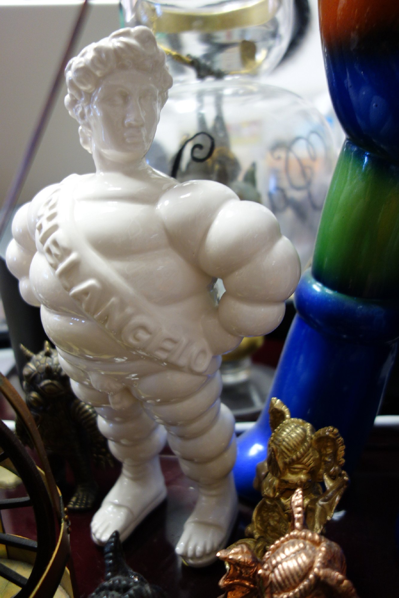 “Michelangelo” is the name engraved on the chest banner. This combines the name “Michelangelo” (the true author and sculptor of the mythical sculpture) and the name of the well known tire company, “Michelin.” This brand in fact is represented by the “bibendum,” an imaginary man-like creature made of soft circles that looks as if it was made up of car tires. It’s a symbol of our contemporary imagery, recognizable in our everyday urban life as a strong symbol of mass production, representing an established aesthetic rather than just the mere association to a single product. So Michelangelo is the David that sheds his traditional context and enters into a new suit. It exits its academic role assuming a new identity (more “pop”), becoming more reachable and accessible to the masses.