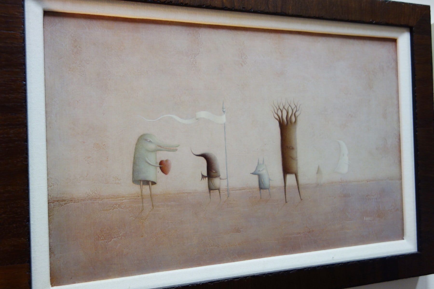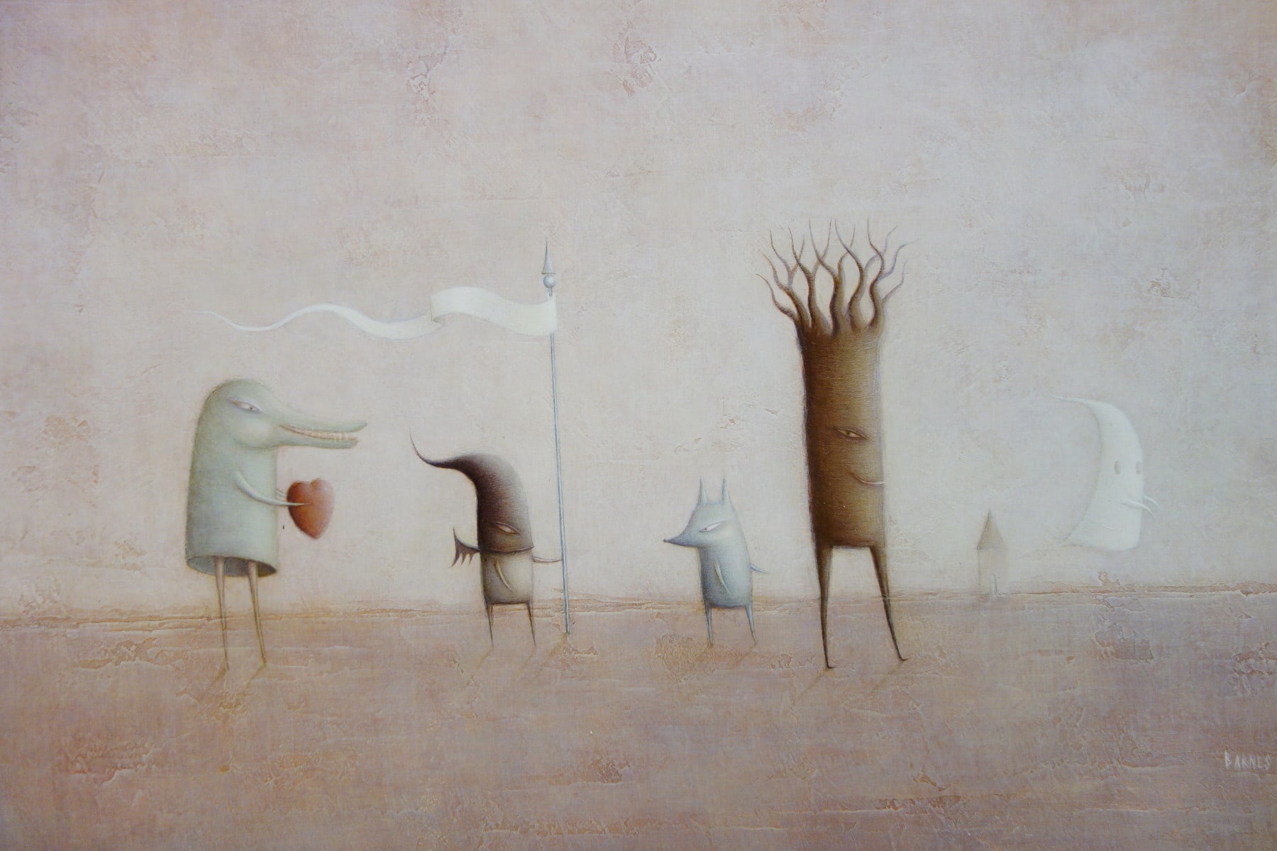 Paul’s beautifully stylized anthropomorphic characters are metaphors for elements of the human condition and they weave gentle narratives infused with myth and magic. Forever fascinated with the past, Barnes paints with a soft and subtle color palette on textured support, which lends his work the time-worn appearance of ancient relics. It is through his collection of masterful visual cues that Paul invites the viewer to revisit their childhood naivety and unlock the innocent imagination which accompanies it.