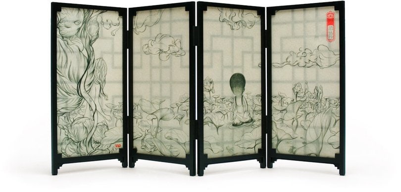 This edition of delicate miniature folding screens has been hand assembled from laser-cut, painted wooden pieces and features an intaglio print of an exclusive drawing by James Jean. Each print has been impressed onto a traditional and subtly translucent Japanese paper and signed, numbered and gocco-printed with an insignia by James.