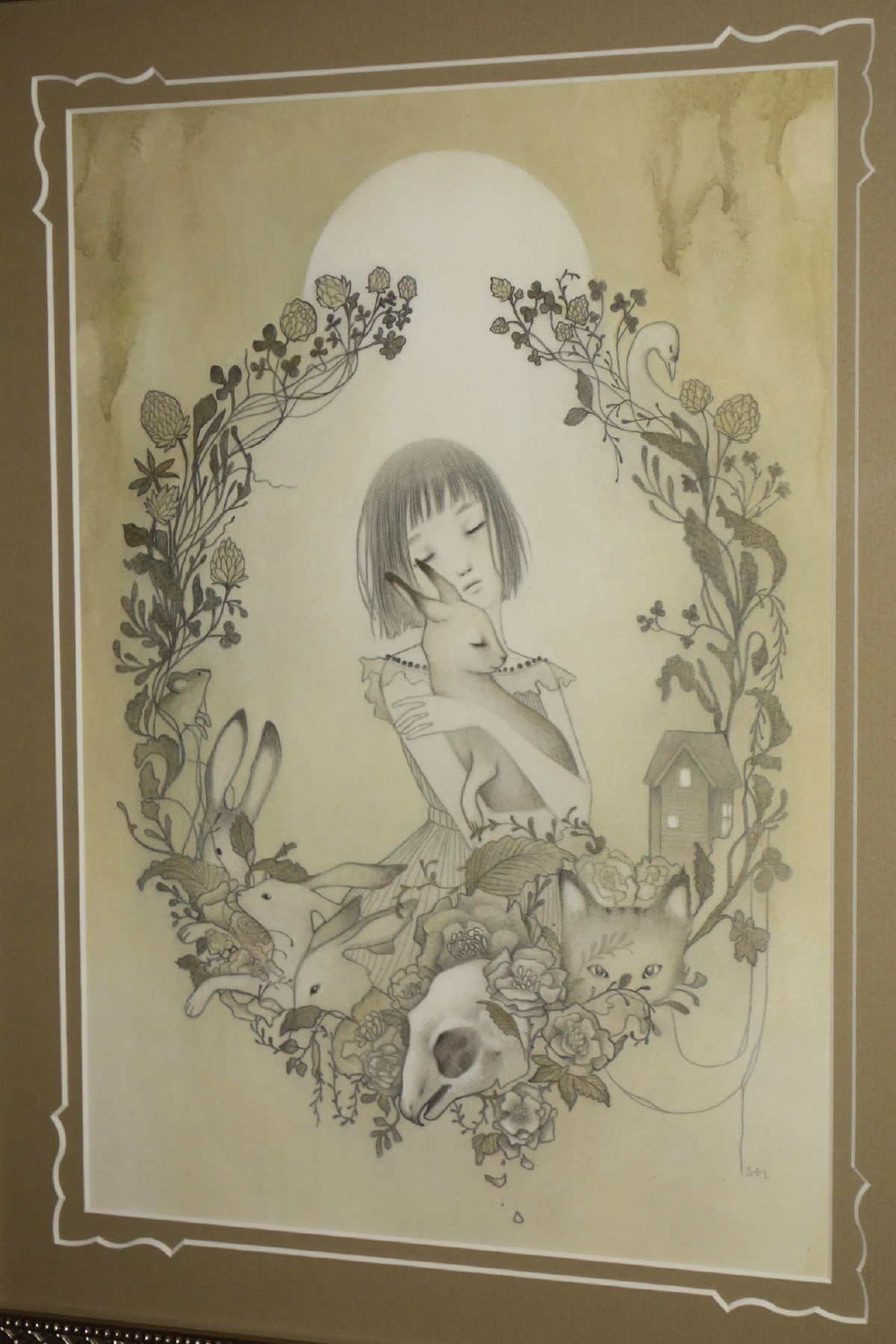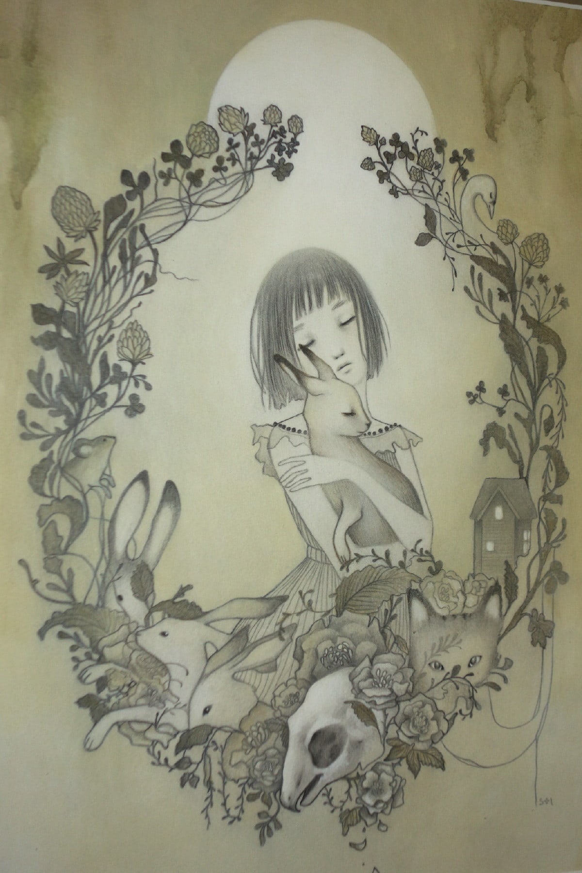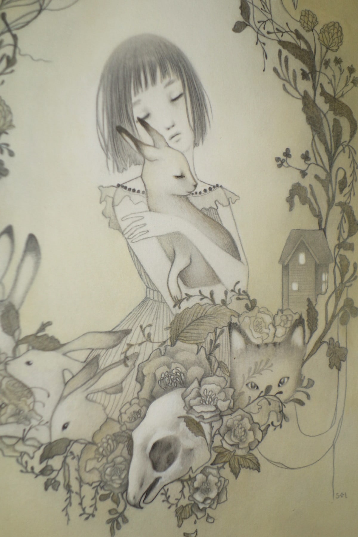 Sol's works are characterized by young maidens in dream-like nature settings with oversized or sometimes fanciful creatures. One gets a sense that the girls are interacting with the animals as mythic partners or perhaps "familiars." There is no indication that these animals are pets; rather friends or perhaps partners. The exotic landscapes include plants, impossible trees, mist & fog, clouds, flowers, and rolling hills. With a muted pallet of pastels and washed out grays; her style is influenced by folk-art, contemporary illustration, manga, and modern design.