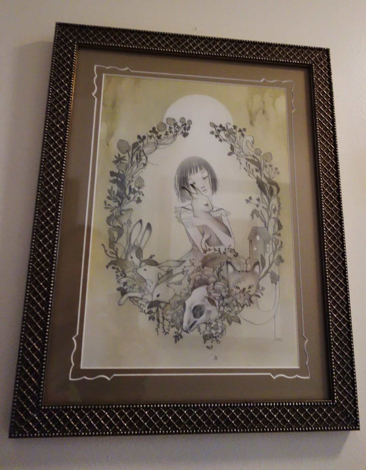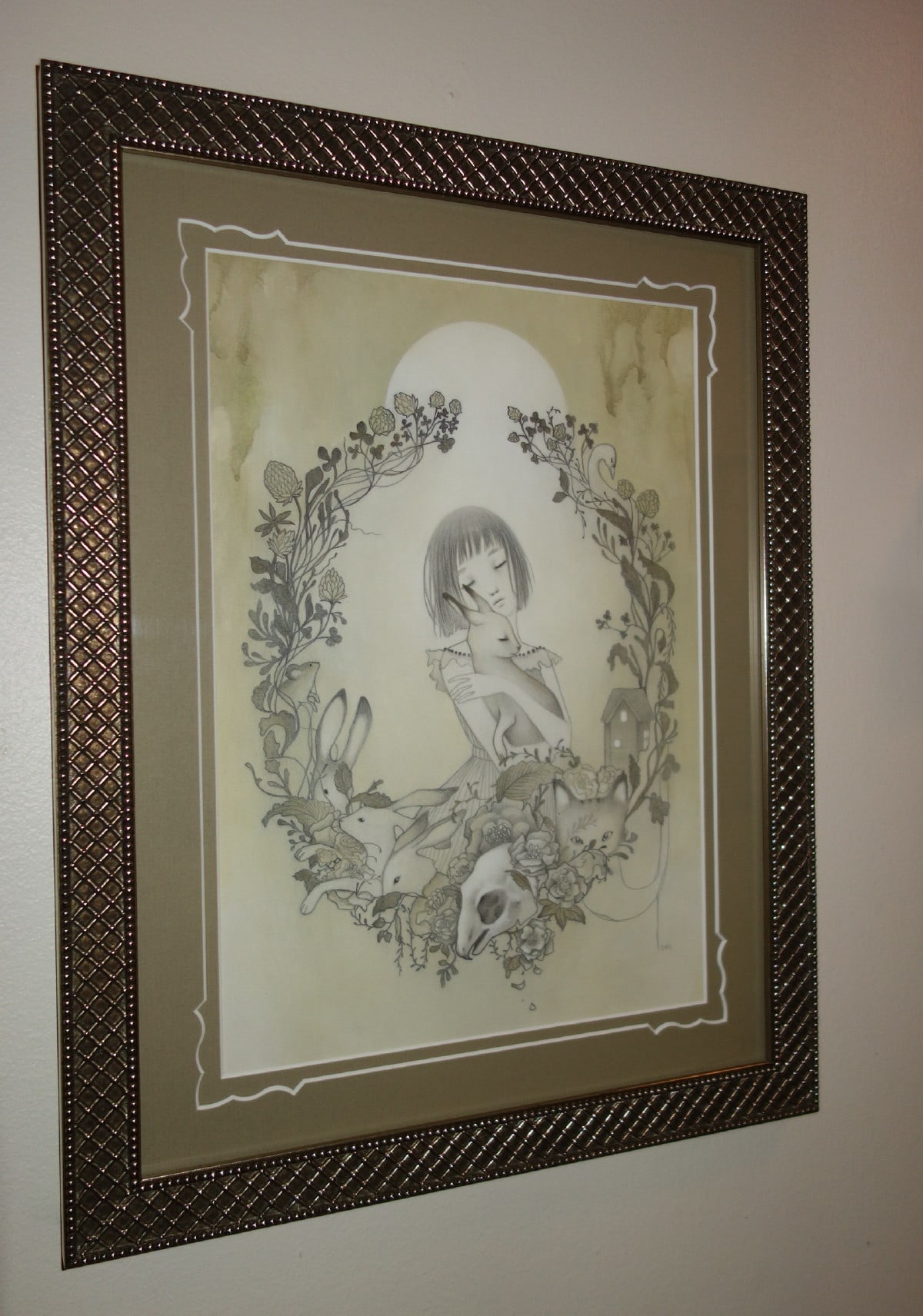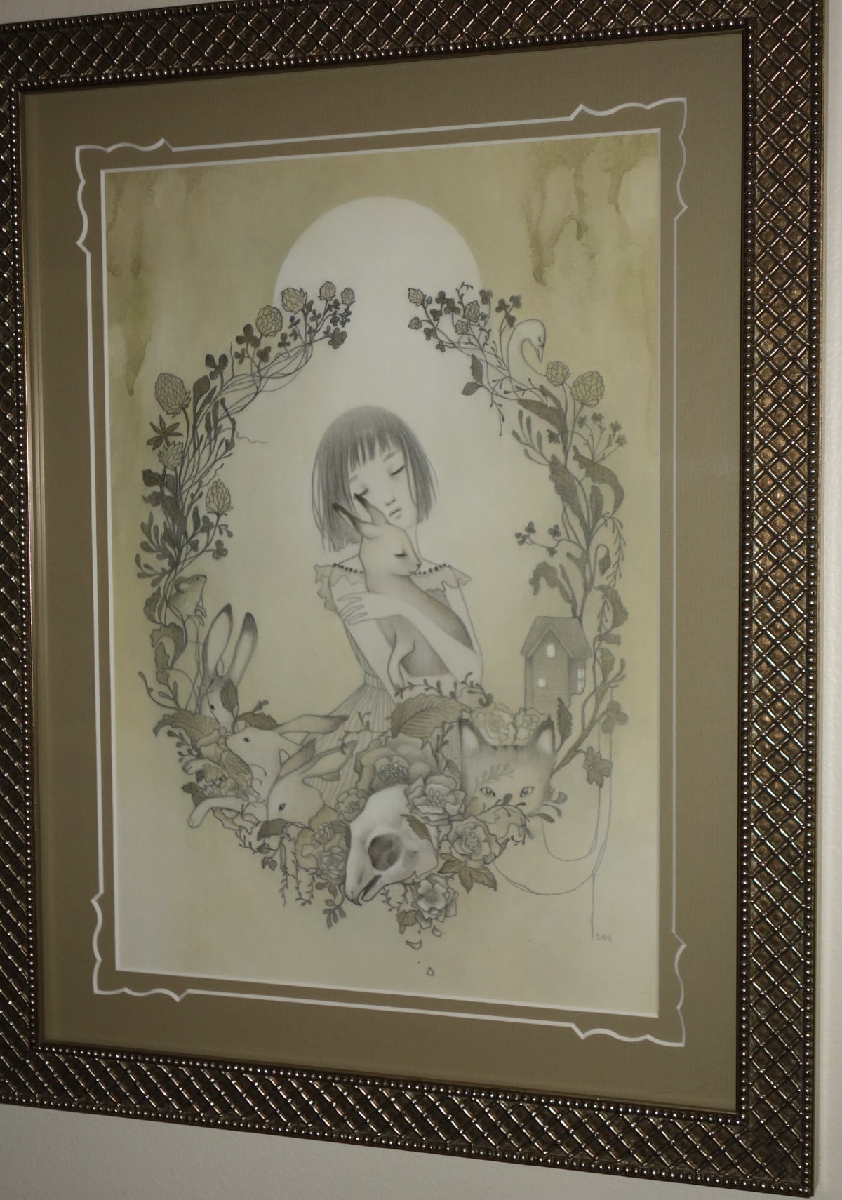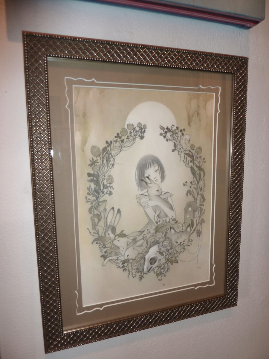 Sol's works are characterized by young maidens in dream-like nature settings with oversized or sometimes fanciful creatures. One gets a sense that the girls are interacting with the animals as mythic partners or perhaps "familiars." There is no indication that these animals are pets; rather friends or perhaps partners. The exotic landscapes include plants, impossible trees, mist & fog, clouds, flowers, and rolling hills. With a muted pallet of pastels and washed out grays; her style is influenced by folk-art, contemporary illustration, manga, and modern design.