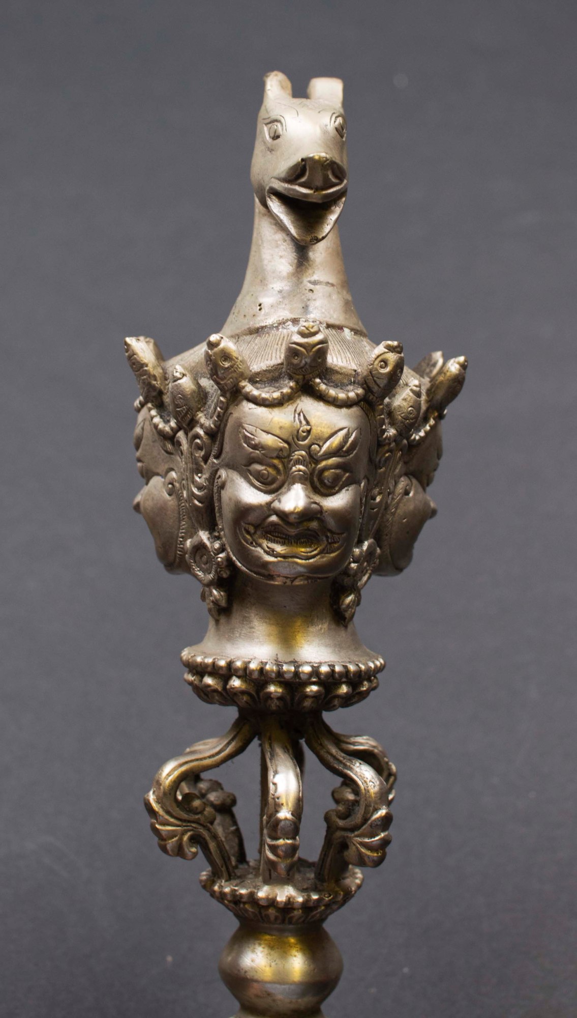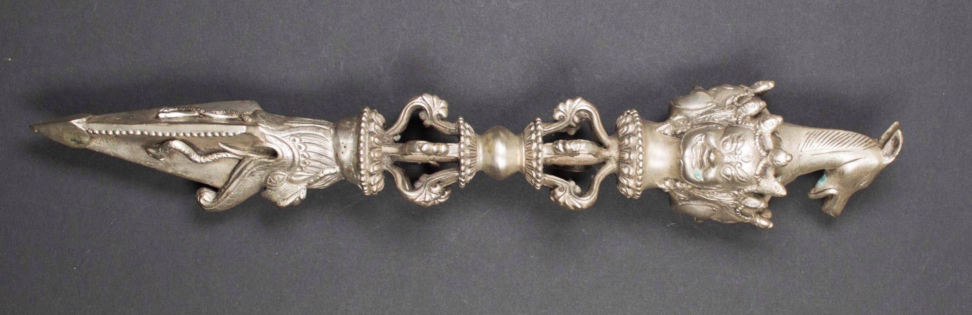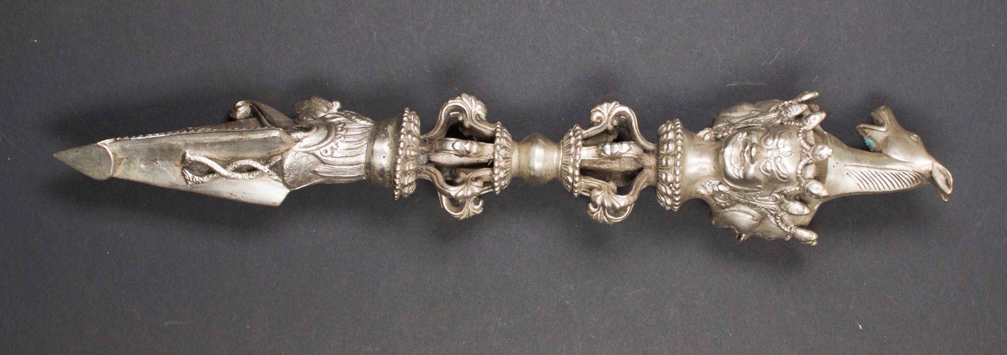 One of the eight fiery defenders of dharma, Hayagriva is depicted with a horse head in his hair. Traditionally crafted from meteoric iron, the phurpa is a ritual dagger most often decorated with the head of Hayagriva.