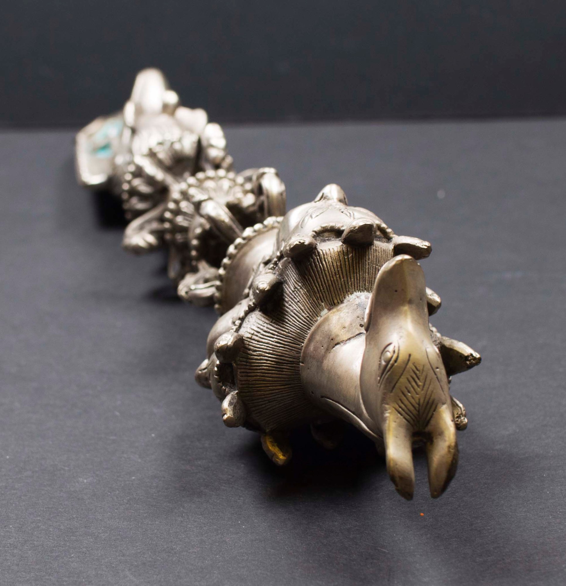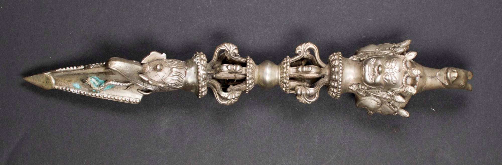 One of the eight fiery defenders of dharma, Hayagriva is depicted with a horse head in his hair. Traditionally crafted from meteoric iron, the phurpa is a ritual dagger most often decorated with the head of Hayagriva.