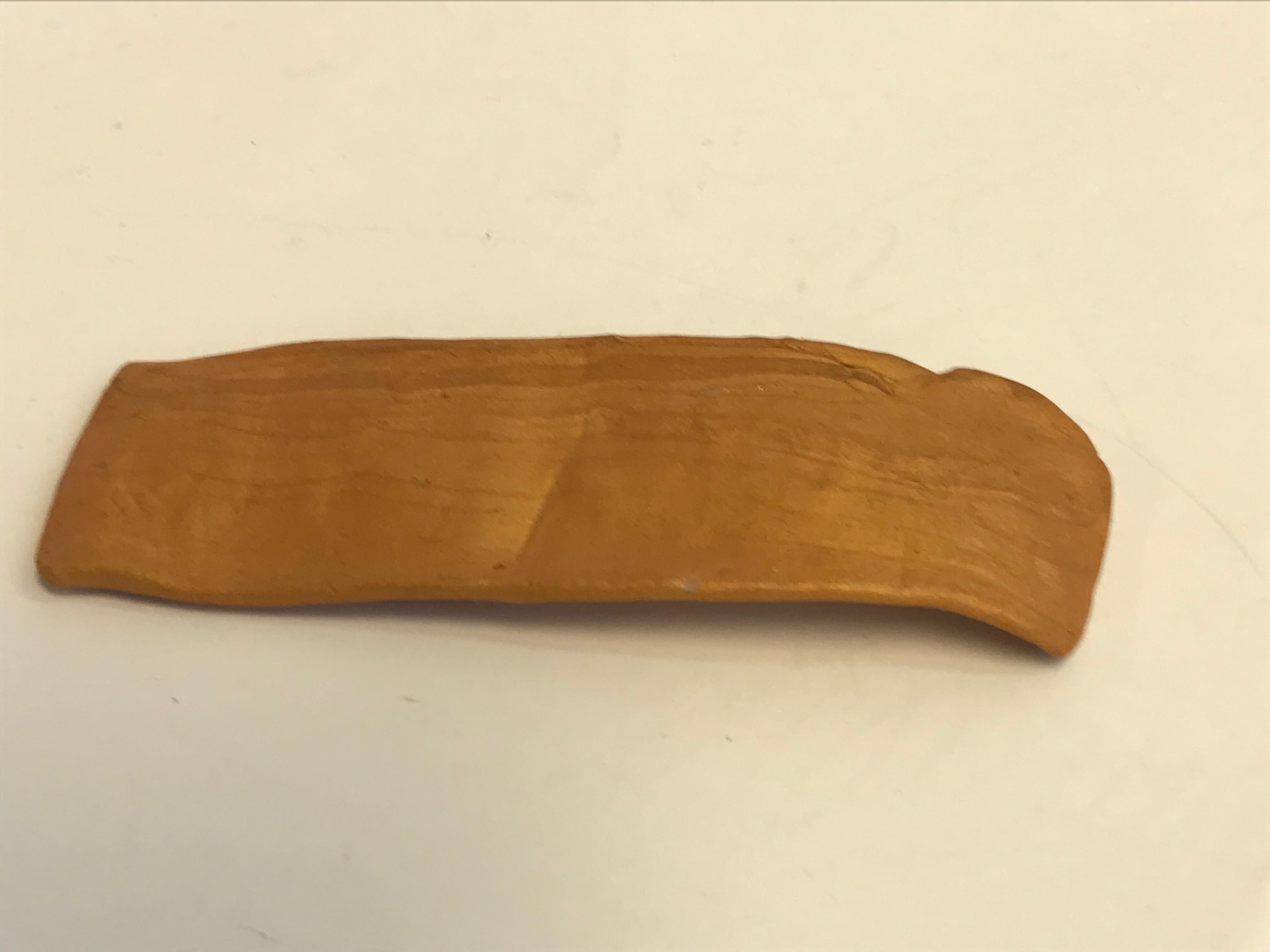This is an impression made from an amethyst seal from bronze age Mesopotamia/Sumeria (2014.67). It is oblong in shape with a hole in the middle, to be hung on a string as a bead.