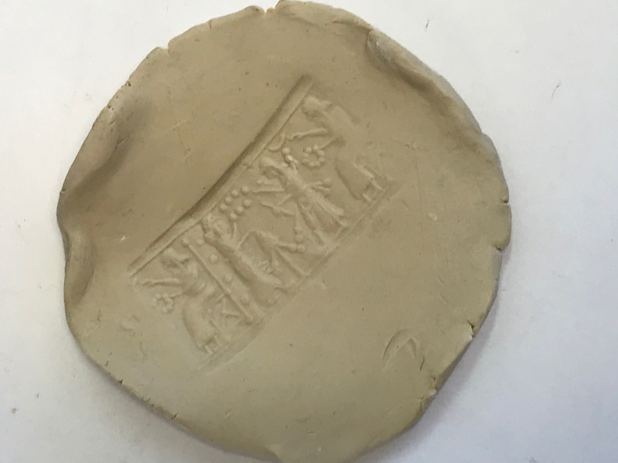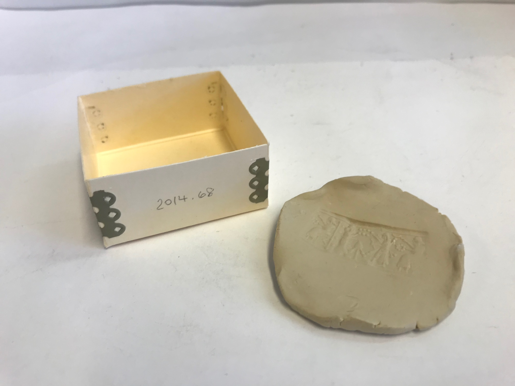 This is an impression made from an amethyst seal from bronze age Mesopotamia/Sumeria (2014.67). It is oblong in shape with a hole in the middle, to be hung on a string as a bead.