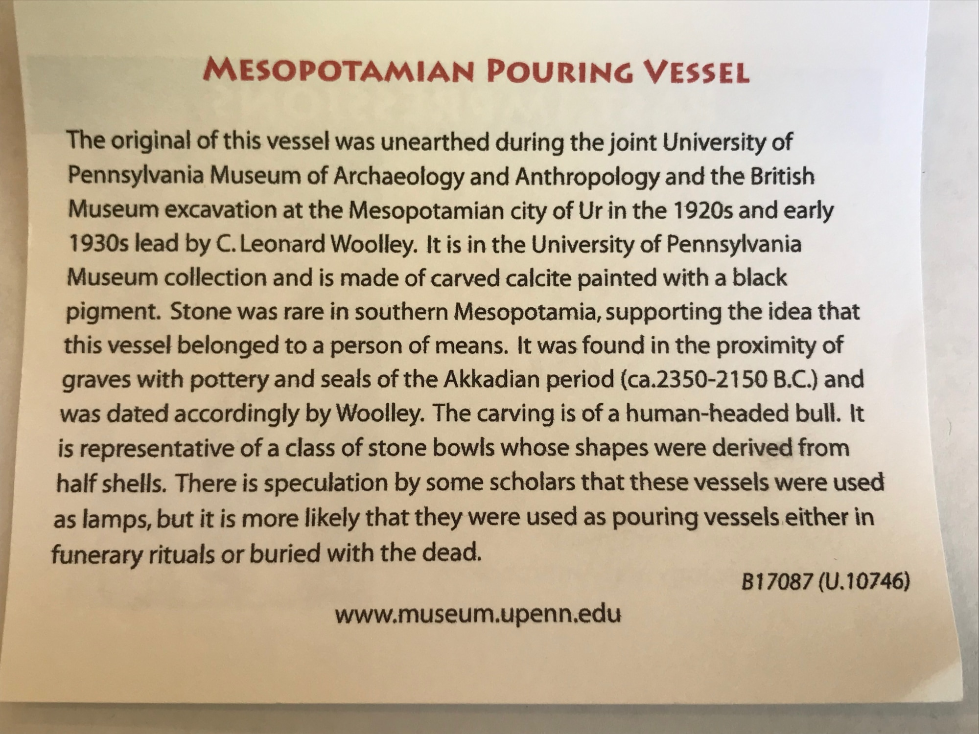 The original is a carved stone pouring vessel featuring a recumbent man-headed bull. This piece was unearthed during the joint University of Pennsylvania Museum of Archaeology and Anthropology and the British Museum excavation at the Mesopotamian city of Ur in the 1920s. Original is in the University of Pennsylvania Museum collection. Made of carved calcite painted with a black pigment, it is representative of a class of stone bowls with shapes derived from half shells. The object is assumed to be related to ritual pouring in funerary rituals.