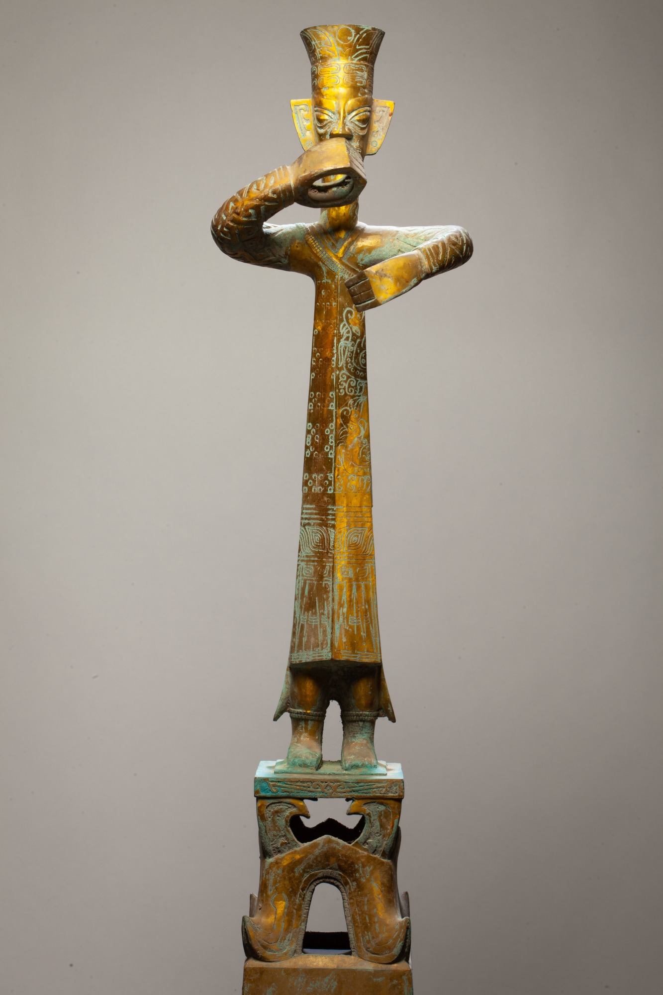 This impressive figure is a shamanic god-king or high priest . He stands on an elephant head. The bronze statue is a reproduction of a larger one (8 1/2 feet tall) that was uncovered at Sanxingdui ("three star mound'), which is 25 miles from the Sichuan capitol Chengdu. Scholars guess that he is holding either a jade cong or an elephant tusk, as both were found in the archeological dig. One of the most important finds in the 20th century, the site yielded jades, bone, pottery, elephant tusks, and large bronzes. The pits where these objects were found, may represent a decommissioning of sacred materials after a disaster (flood or earthquake) or an invasion. No writing has been found to clearly identify the objects. While bronze vessels and objects were made in other locations in China during this period, this culture featured bronze human figures. The GTU collection contains additional objects (2015.15, 2015.16) from the site. (DJS)
