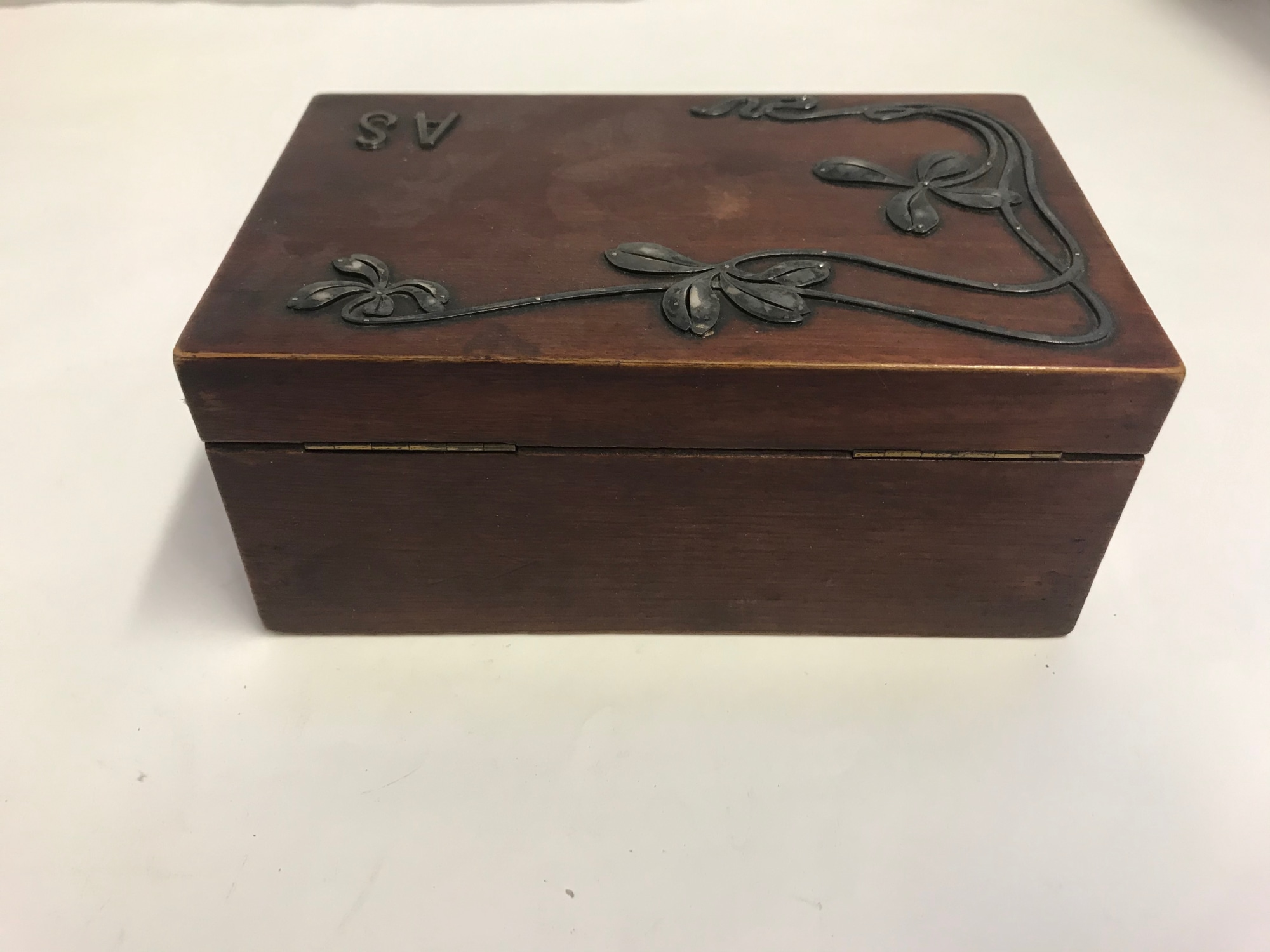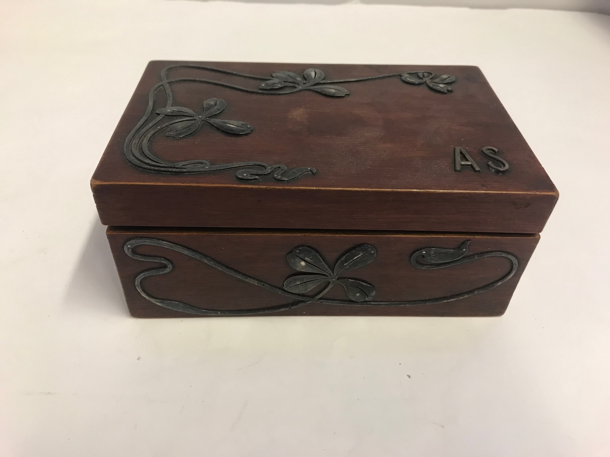 (a) Wood box with deco designs in raised metal, along with the initials A.S.