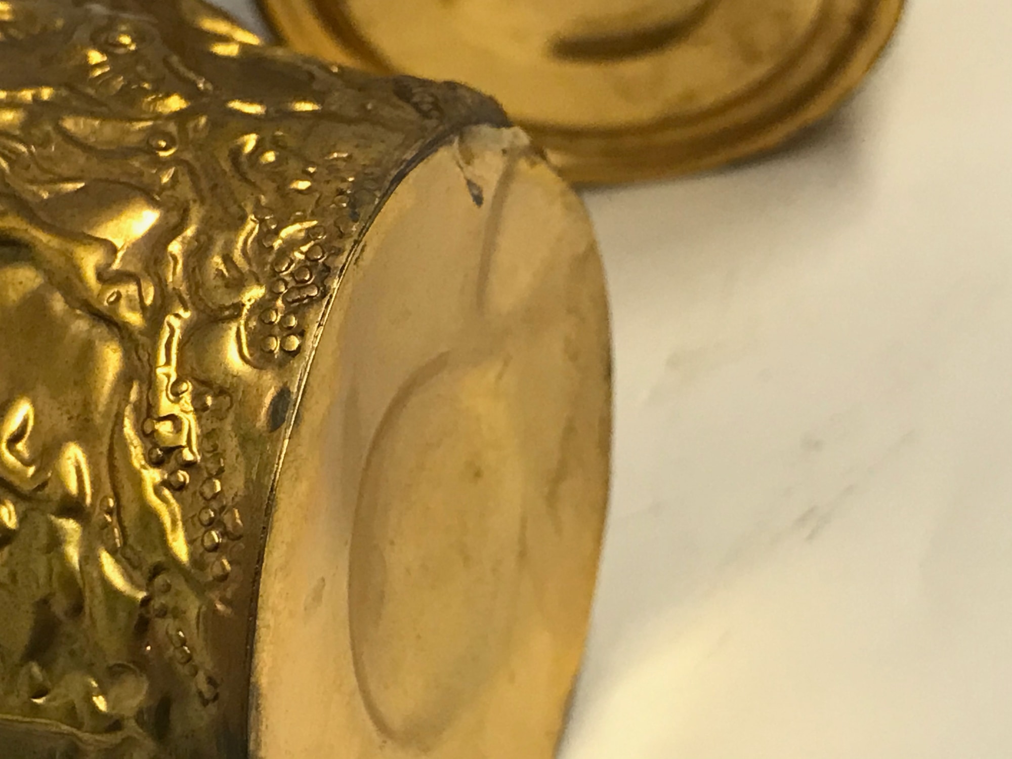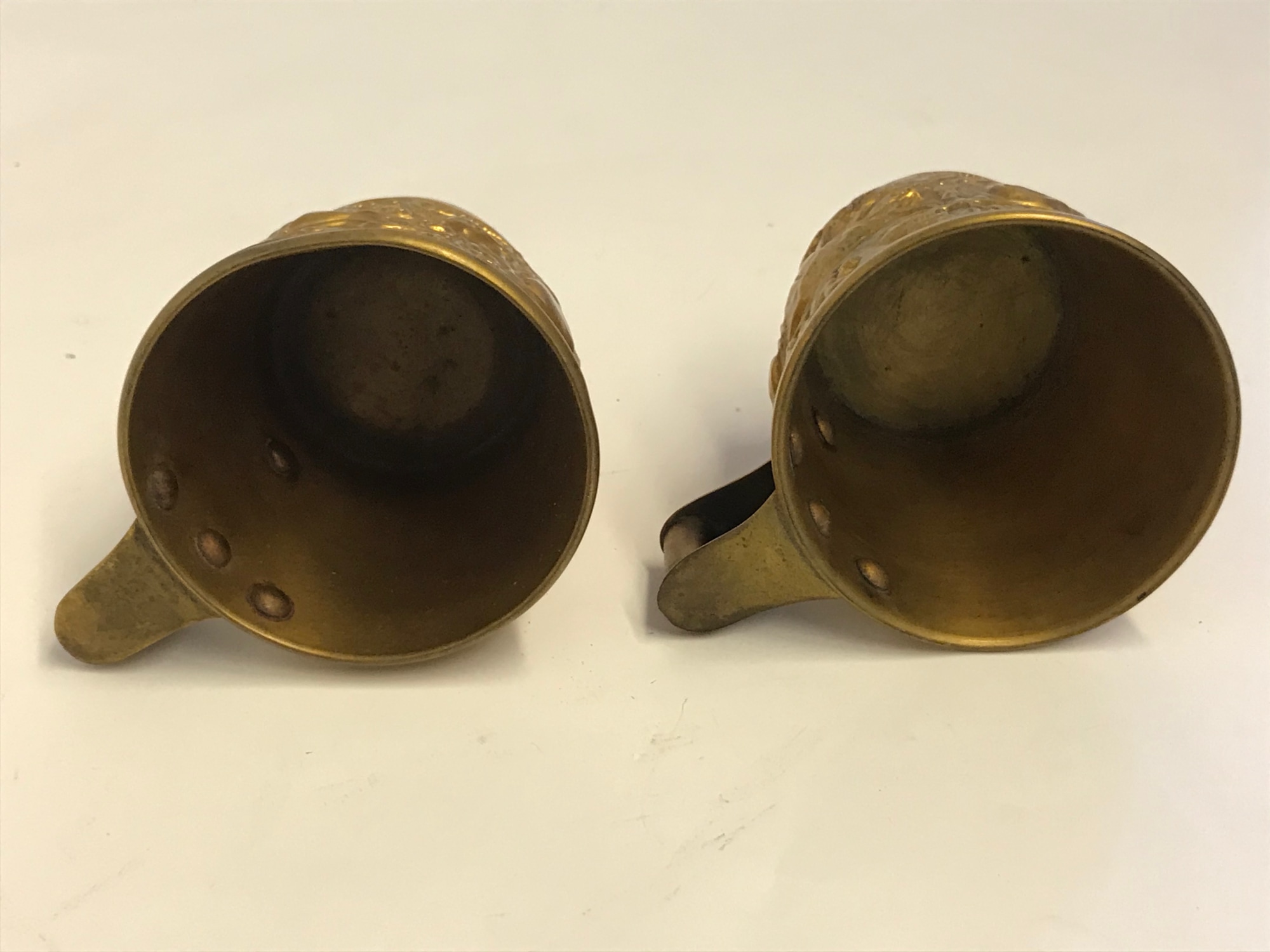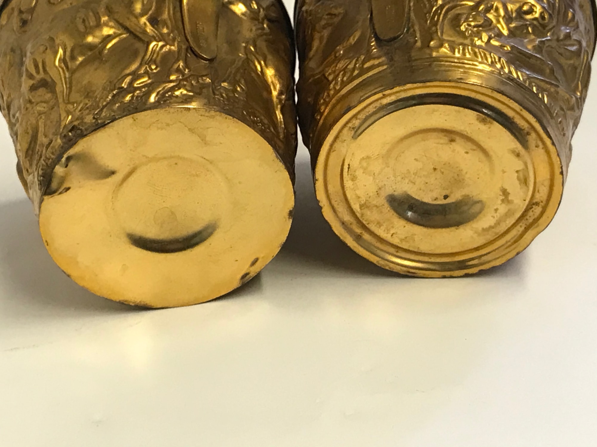 Two shiny metal cups (a) and (b) with scenes in relief depicting bulls. The cups are stamped on the bottom with "Hand Made" and under the handle with "Made in Greece." One weighs 3.6 oz, the other weighs 3.4 oz.
