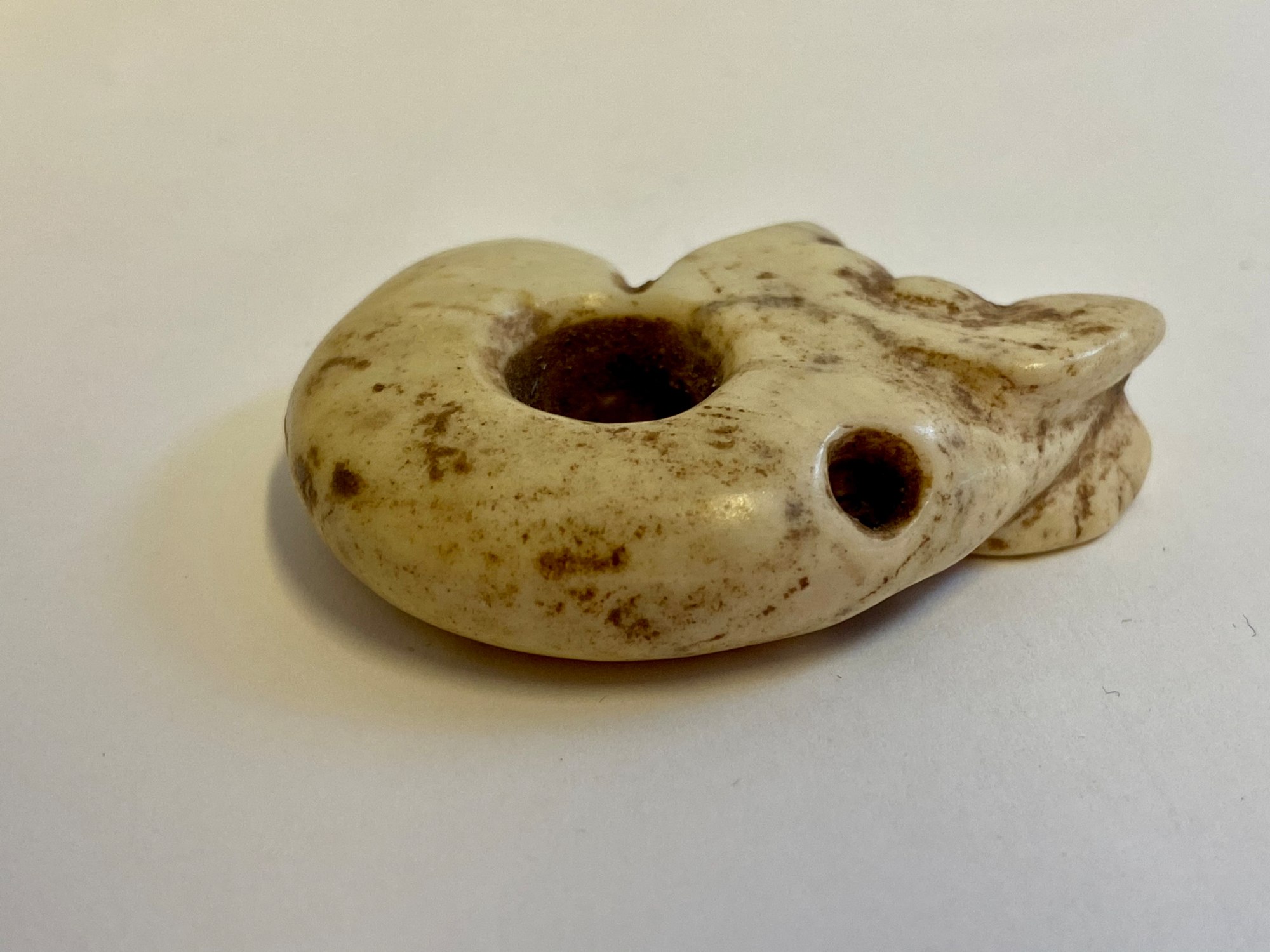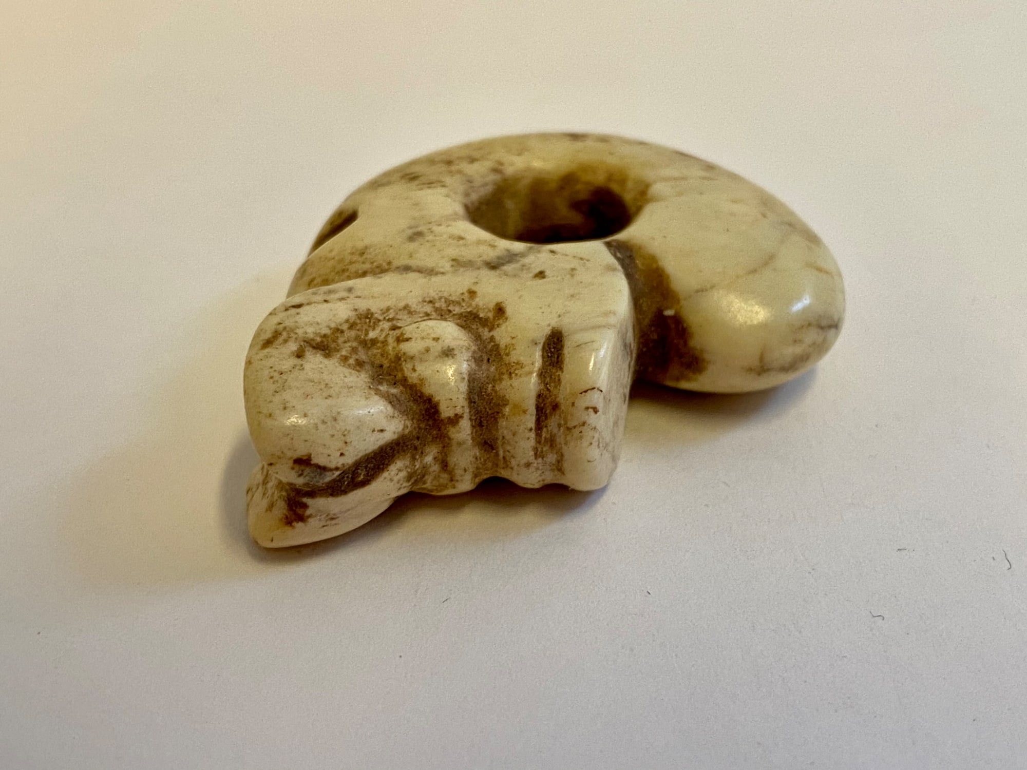 Zoomorphic jade sculpture from the Hongshan culture (4700 – 2900 BCE). Pig-dragon creature coiled into a circle. Hole punctures through nape of figure. Stone is off-white.