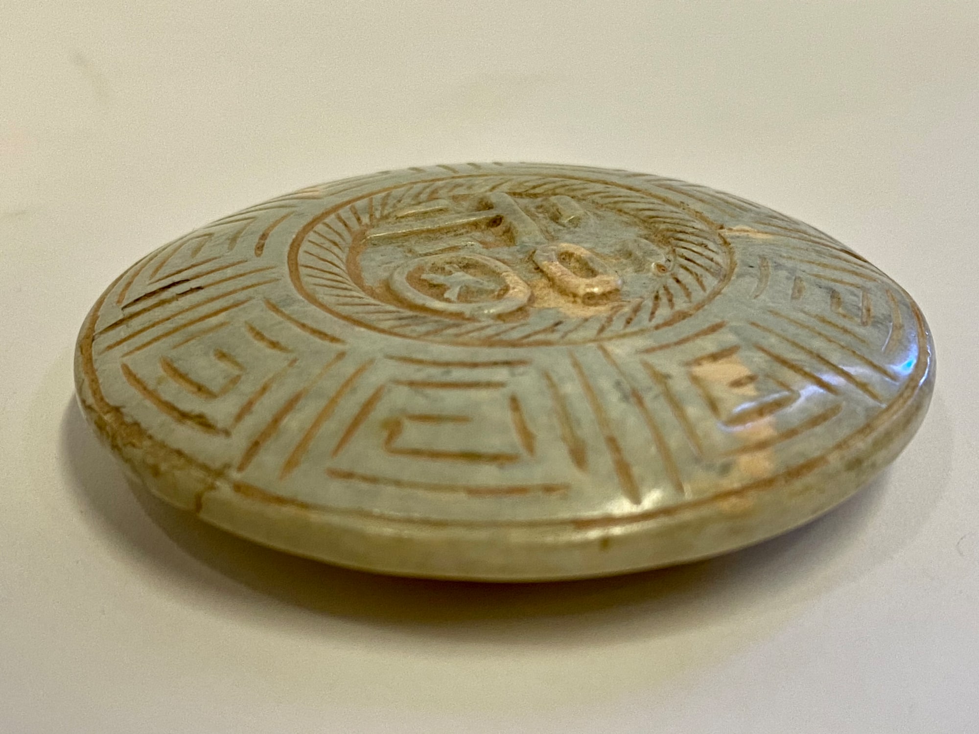 Jade sculpture from the Hongshan culture (4700 – 2900 BCE). Disc adorned with square etchings on the thick border and characters in the center. Both sides are the same. Hole punctures top of sculpture. Stone is very pale blue.