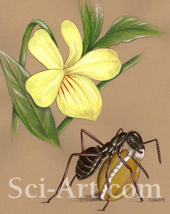The wild violet (Viola nuttallii) produces seeds with nutritious elaiosomes attractive to harvester ants (Pogonomyrmex occidentalis). The plants time seed release to coincide with daily peak ant activity. This relationship between ants and plants is called myrmecochory.