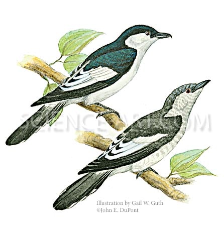 Watercolor illustration of Black-and-White Triller, (Lalage melanoleuca melanoleuca); detail of Plate 72, for field guide "Philippine Birds by John E. DuPont.