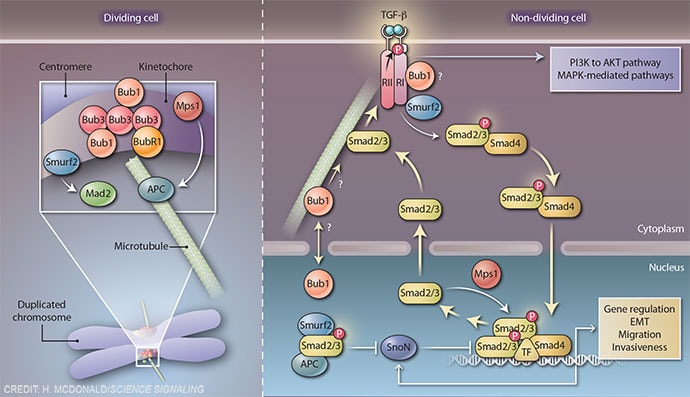 Illustration for a Focus article in Science Signaling titled "The mitotic checkpoint protein kinase BUB1 is an engine in the TGF-β signaling apparatus" [Sci. Signaling 8, fs1 (2015). doi: 10.1126/scisignal.aaa4636].