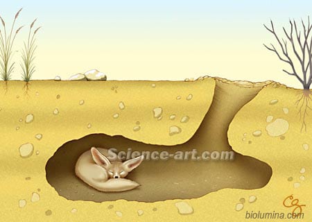 The Fennec is an African desert fox which is well adapted to extremes temperatures. With huge ears and nocturnal habits, he spends the hottest part of the day underground in his cool burrow.