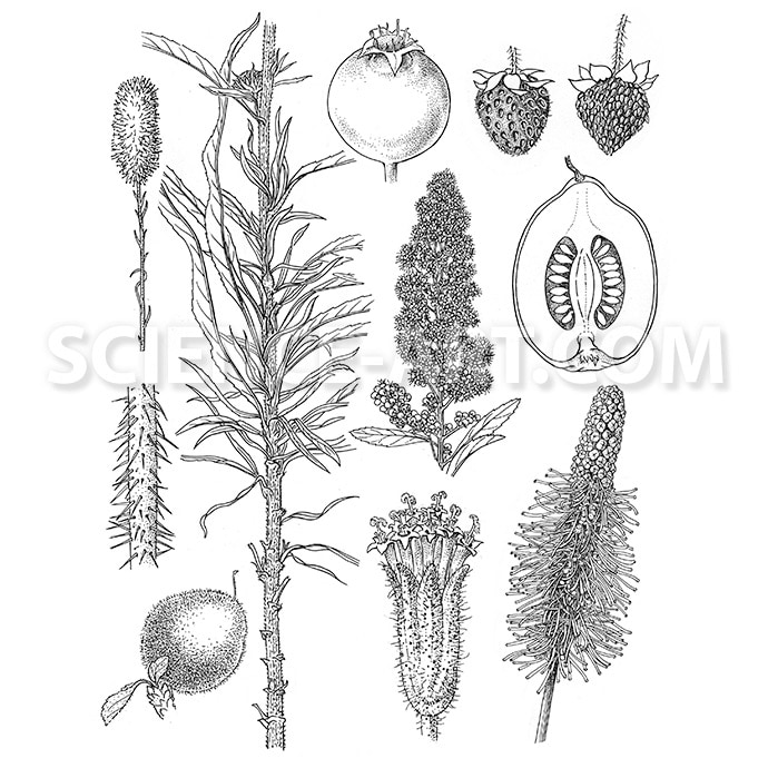 This shows details taken from pen and ink illustrations created for Flora of North America, Vol 9, Rosaceae.