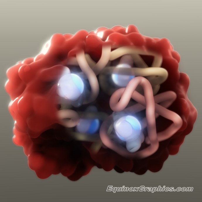 Illustration for Sekisui Diagnostics, showing a haemoglobin molecule with each of the four chains and four haeme groups (which are where the oxygen binds).