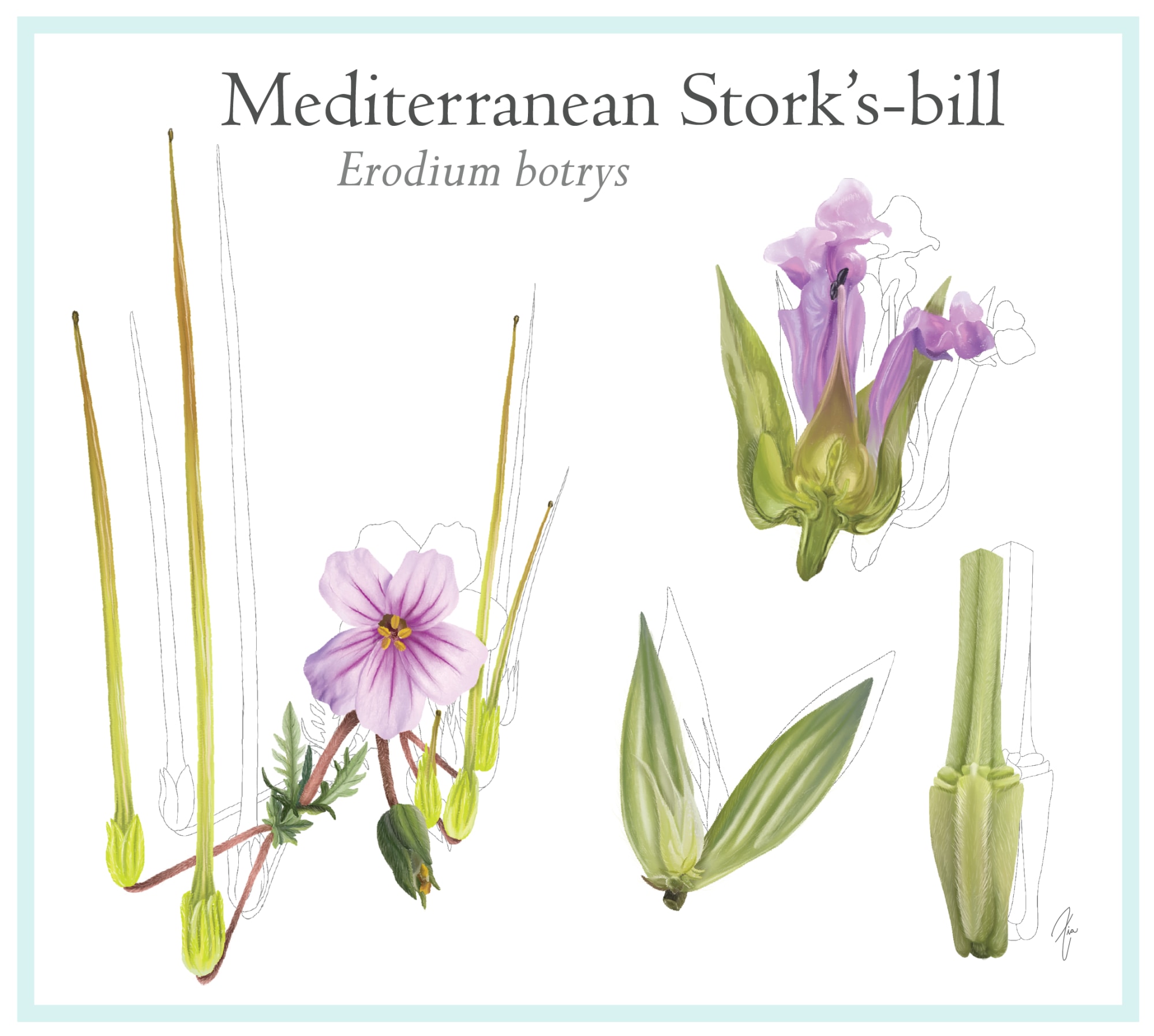 An information card showing dissected plant parts of a Mediterranean Stork's-bill flower. This flower is commonly found during early spring.