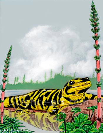 Tiger salamander at the edge of a pond near horsetails and liverwort