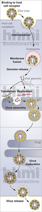 Illustration created for HHMI Biointeractive (www.hhmi.org/biointeractive) educational resources, showing the Zika virus life cycle in a format designed to be viewed on a mobile device.
