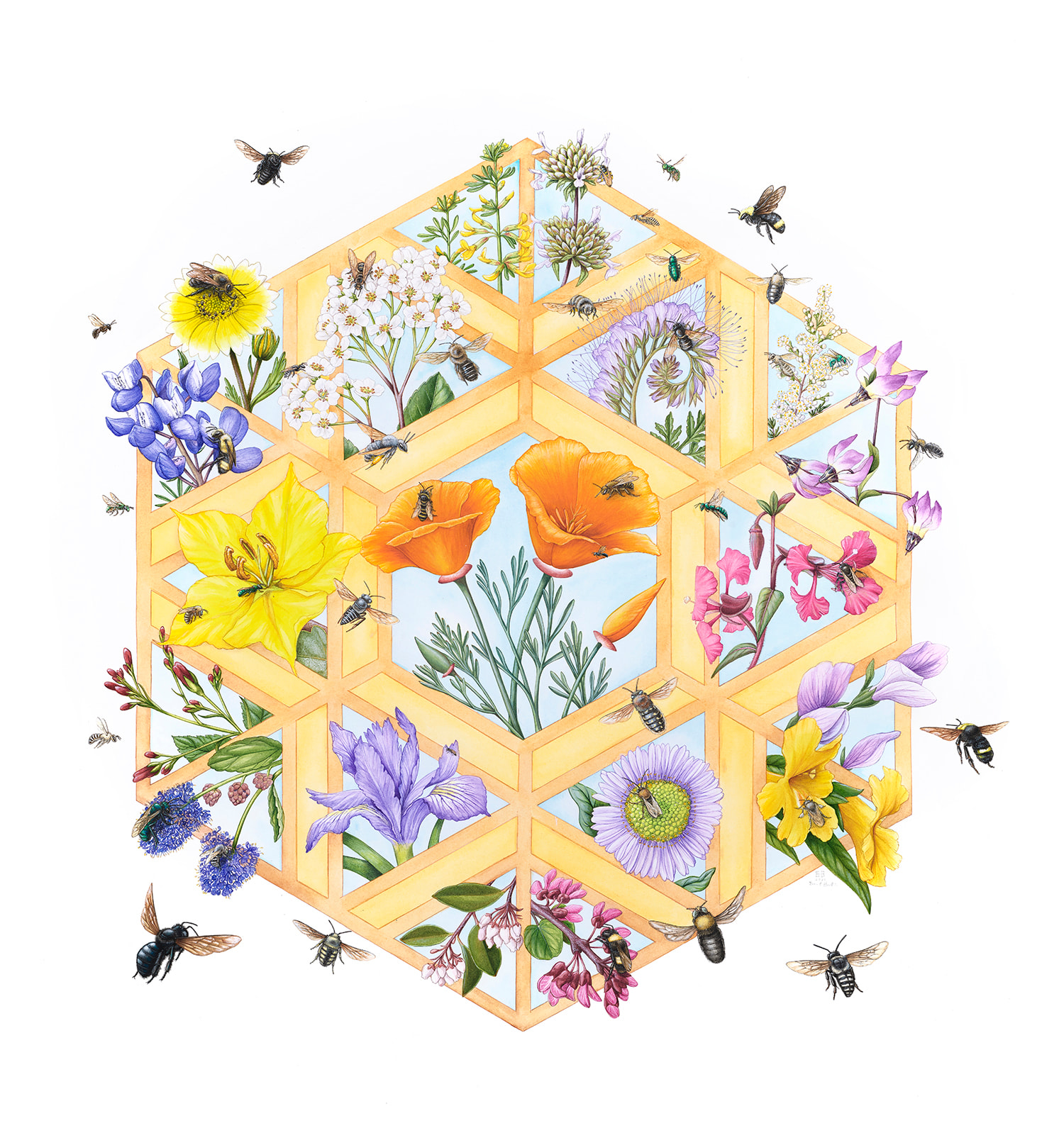 Part of a series of California flora and pollinators, this painting depicts bees native to Monterey County and local wildflowers pollinated by them. Each flower and bee is painted at three times life size to show the beautiful details that distinguish each species, which become quite clear when viewed up close.