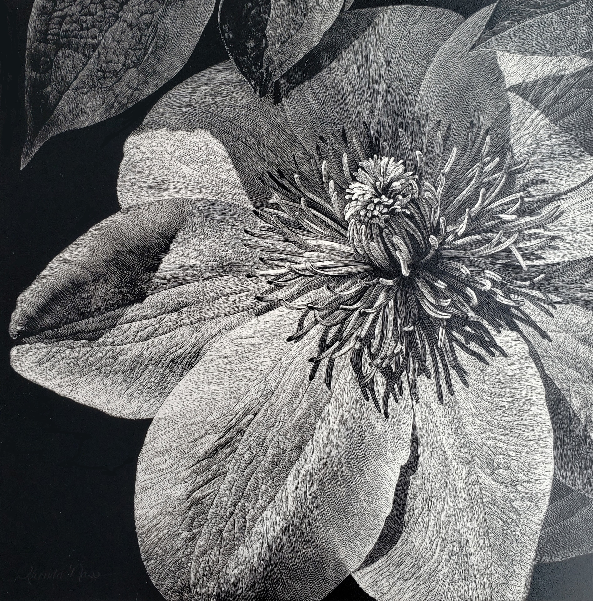 6"x 6" scratchboard (mounted on birch panel) of clematis foliage and bloom depicting the translucency of delicate petals...thus "Lustrous Clematis"