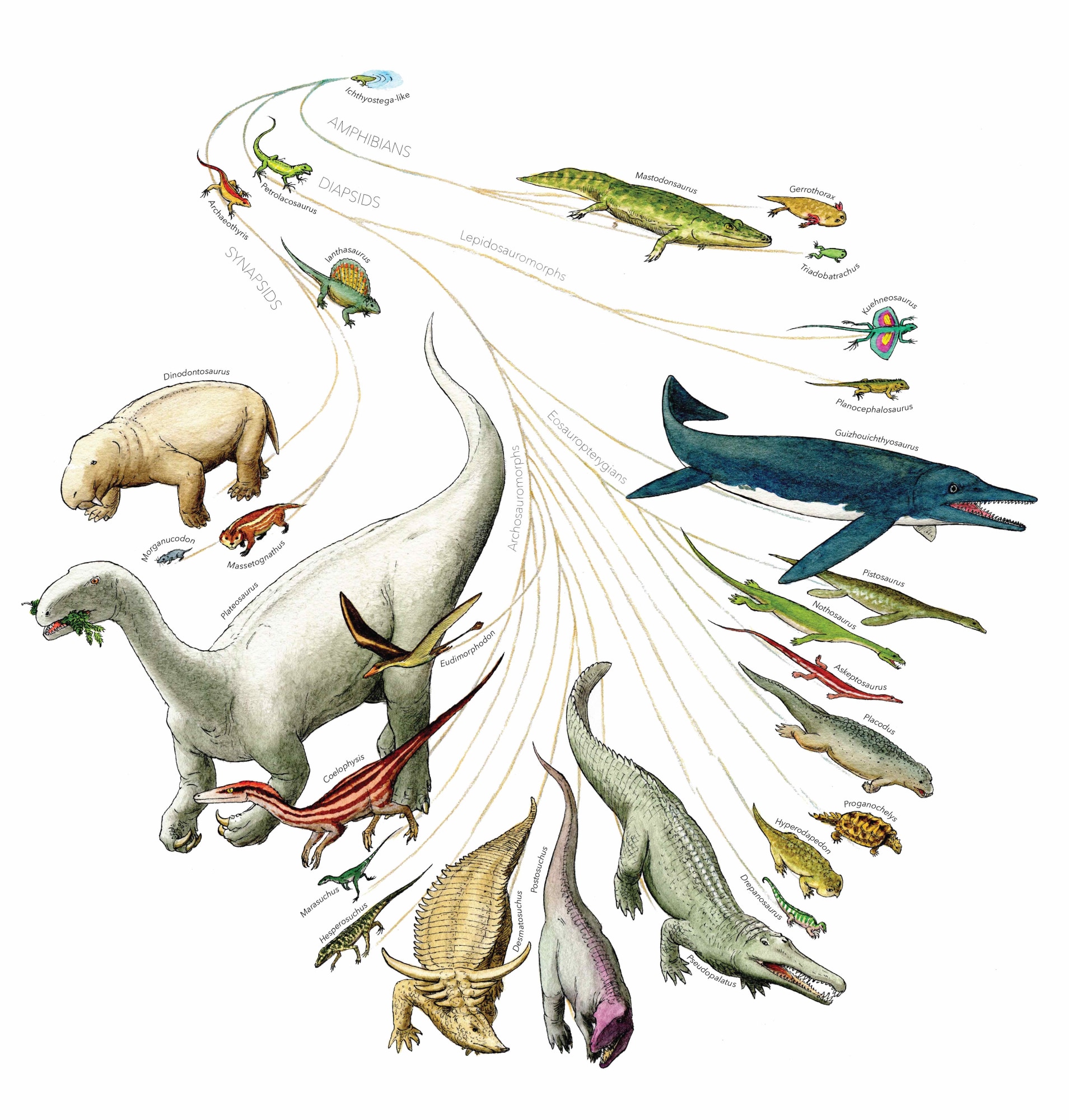 After the massive end-Permian extinction, theTriassic Period witnessed an unprecedented radiation of tetrapods, both on land and in the sea. This piece was created for an upcoming exhibit at U.C. Berkeley. It was commissioned by Professor Cindy Looy.