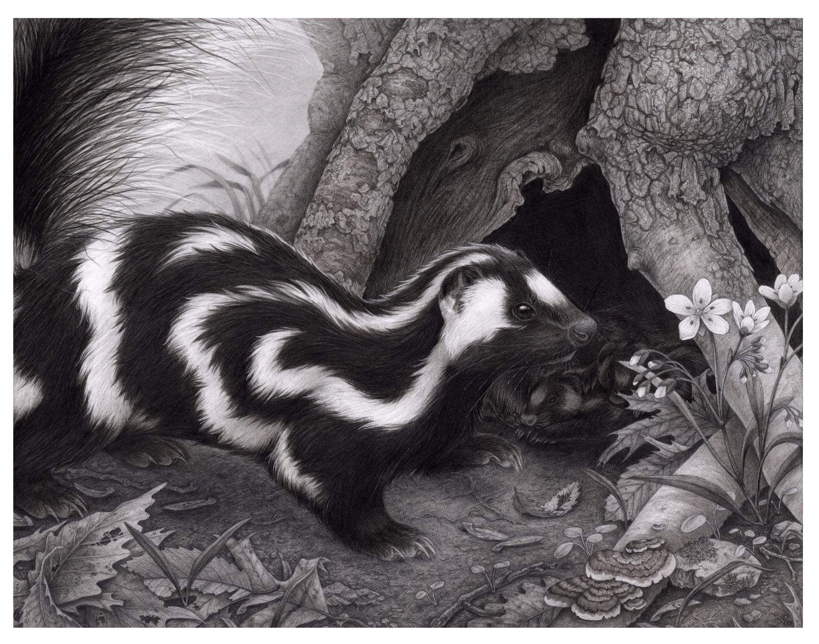 A piece depicting the endangered eastern spotted skunk with a spring beauty flower. Done for Virginia DWR's "Restore the Wild" art competition.