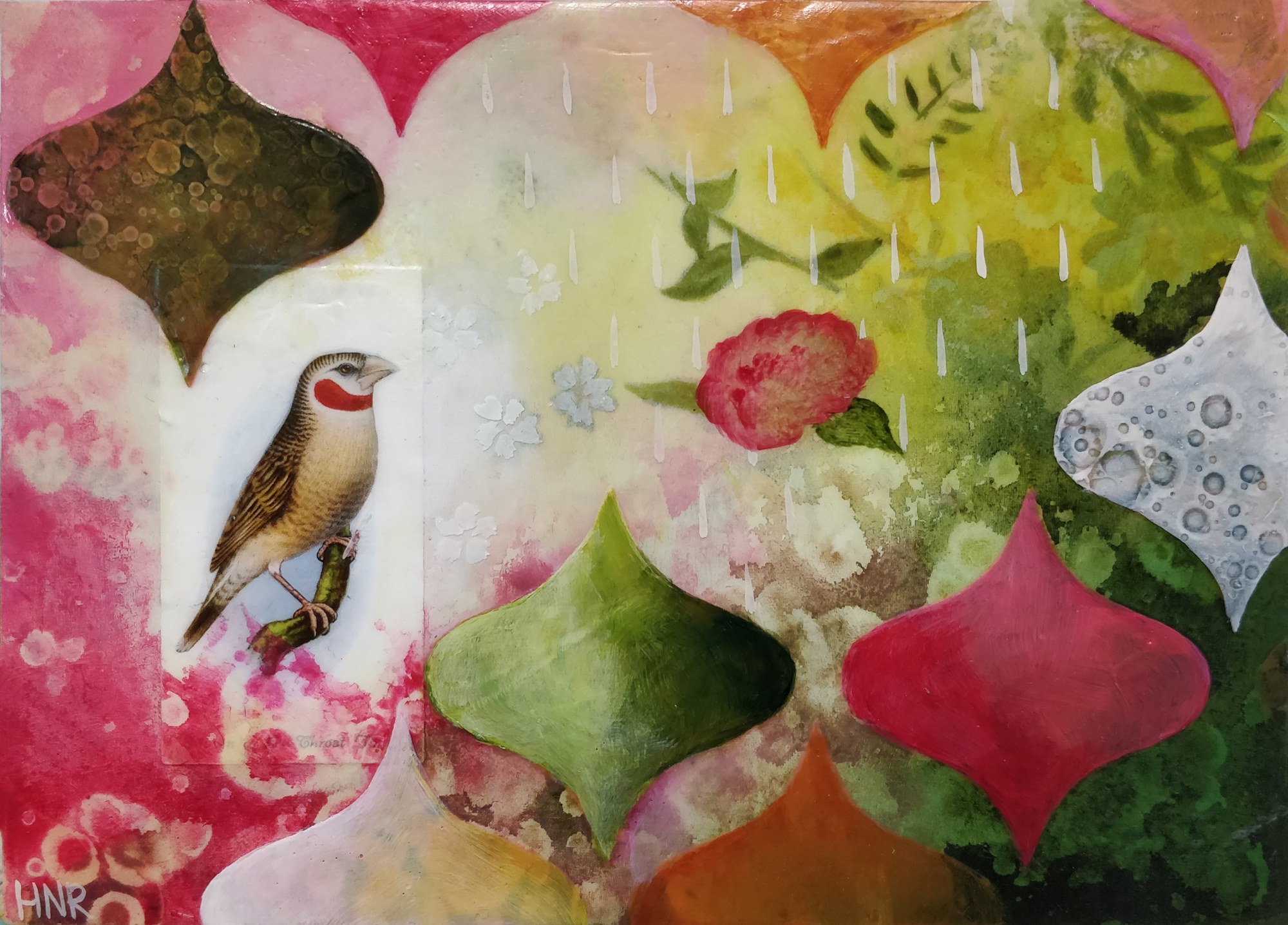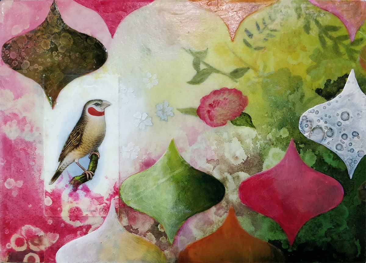 Acrylic, fabric, paper on panel