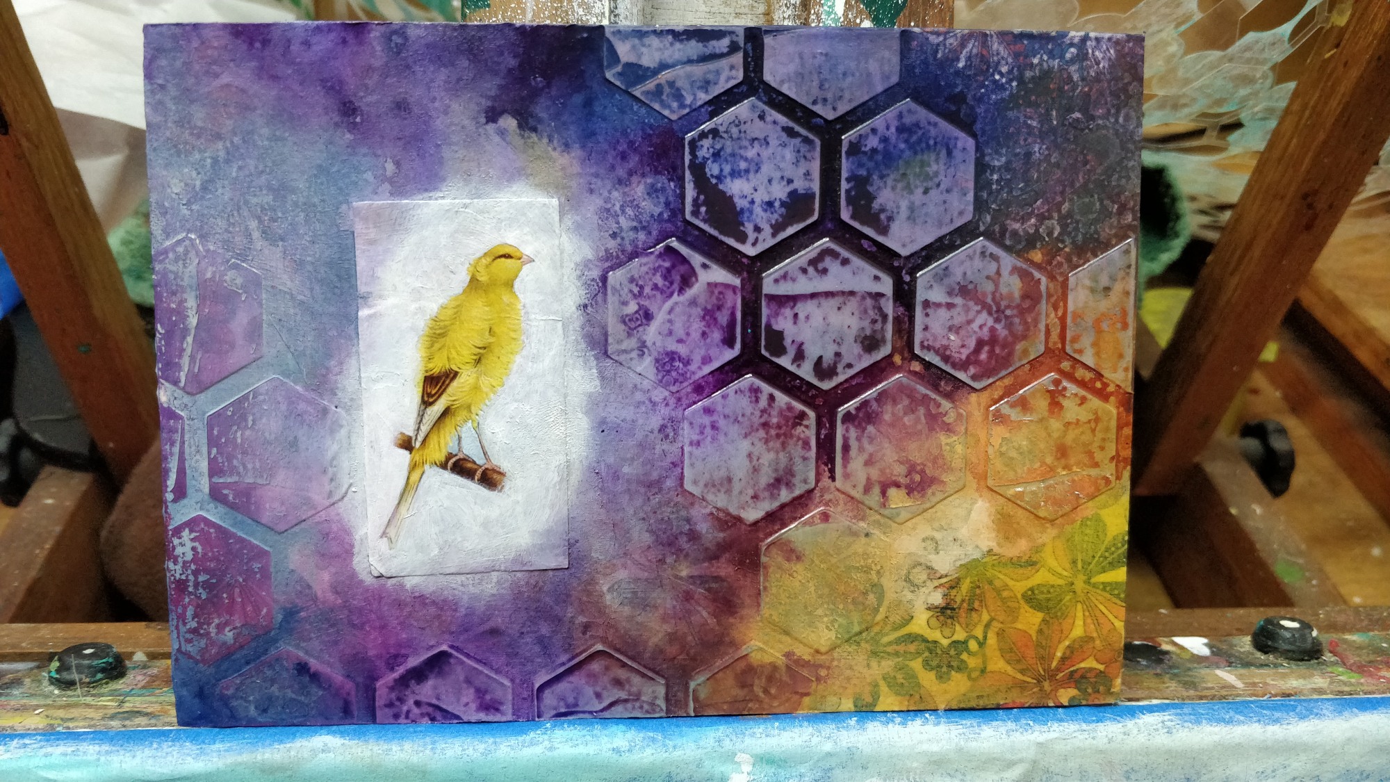 Acrylic, fabric, paper on panel