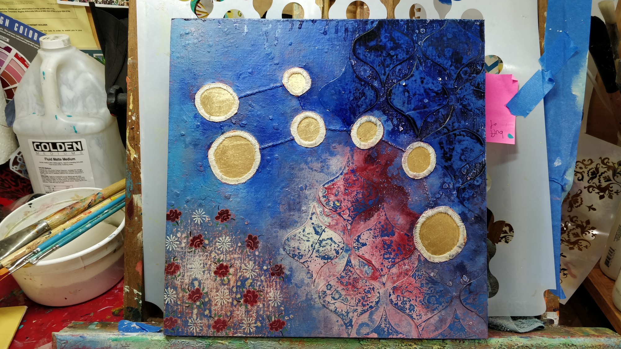 Acrylic, fabric, embroidery and gold leaf on panel