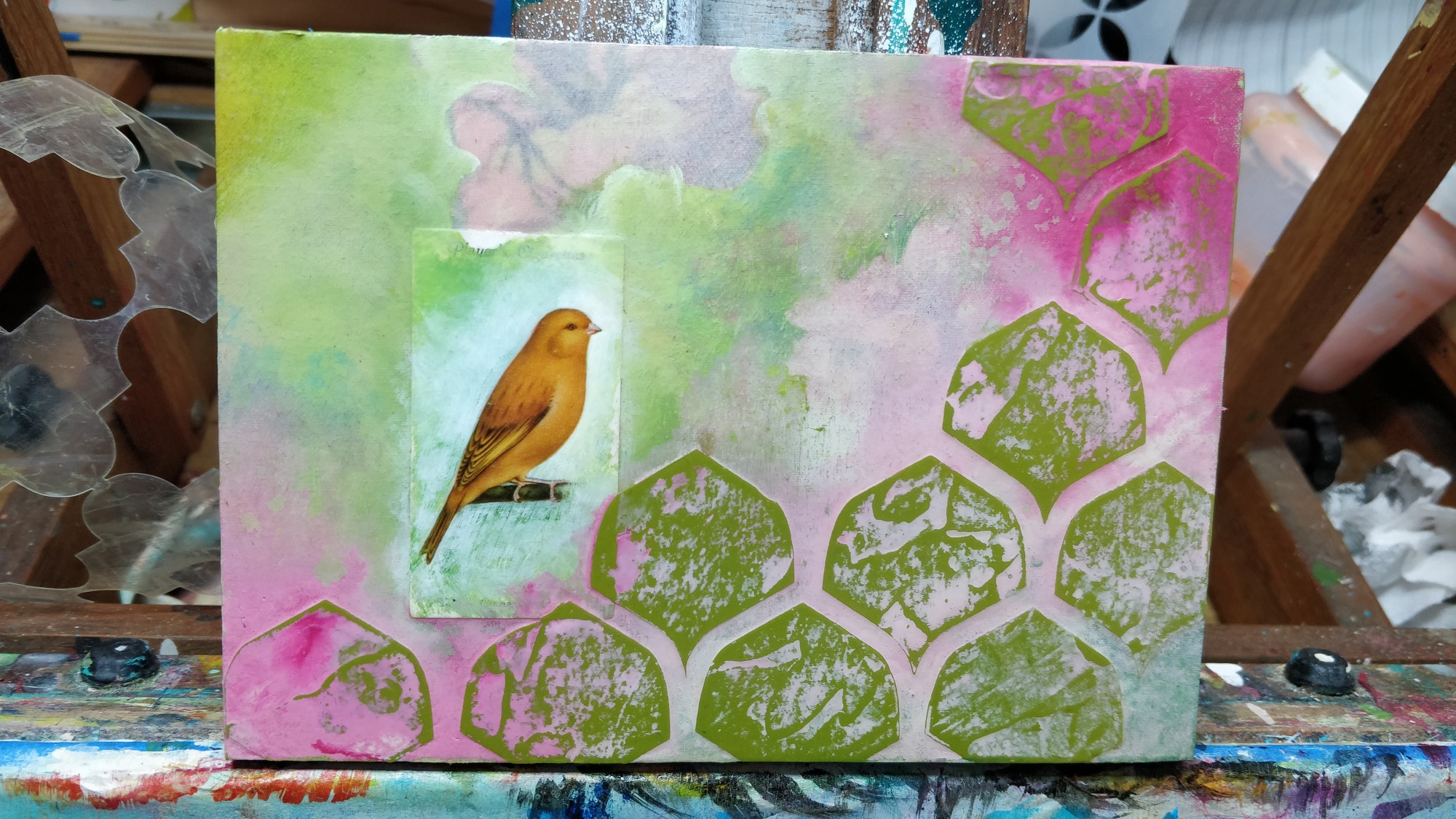 Acrylic, fabric, paper on panel