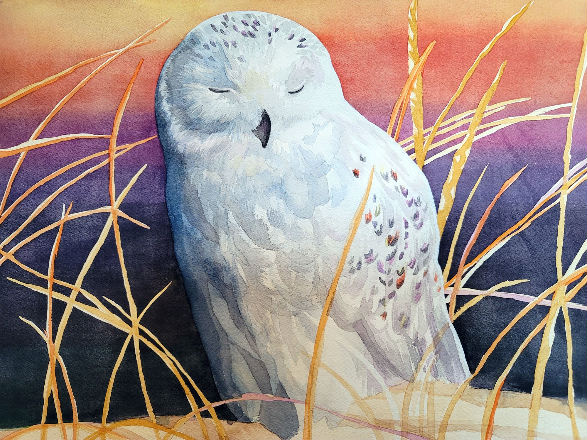 Female Snowy Owl Sleeping. They venture from the sandy beaches of L.I. from far north of the Arctic Circle. They have many names including the Polar owl, Artic owl, Scandinavian night bird, great white owl, and terror of the north. They are listed as vulnerable by (IUCN) International Union for Conservation of Nature. They keep warm with their abundance of feathers which makes them the heaviest owls in North America.