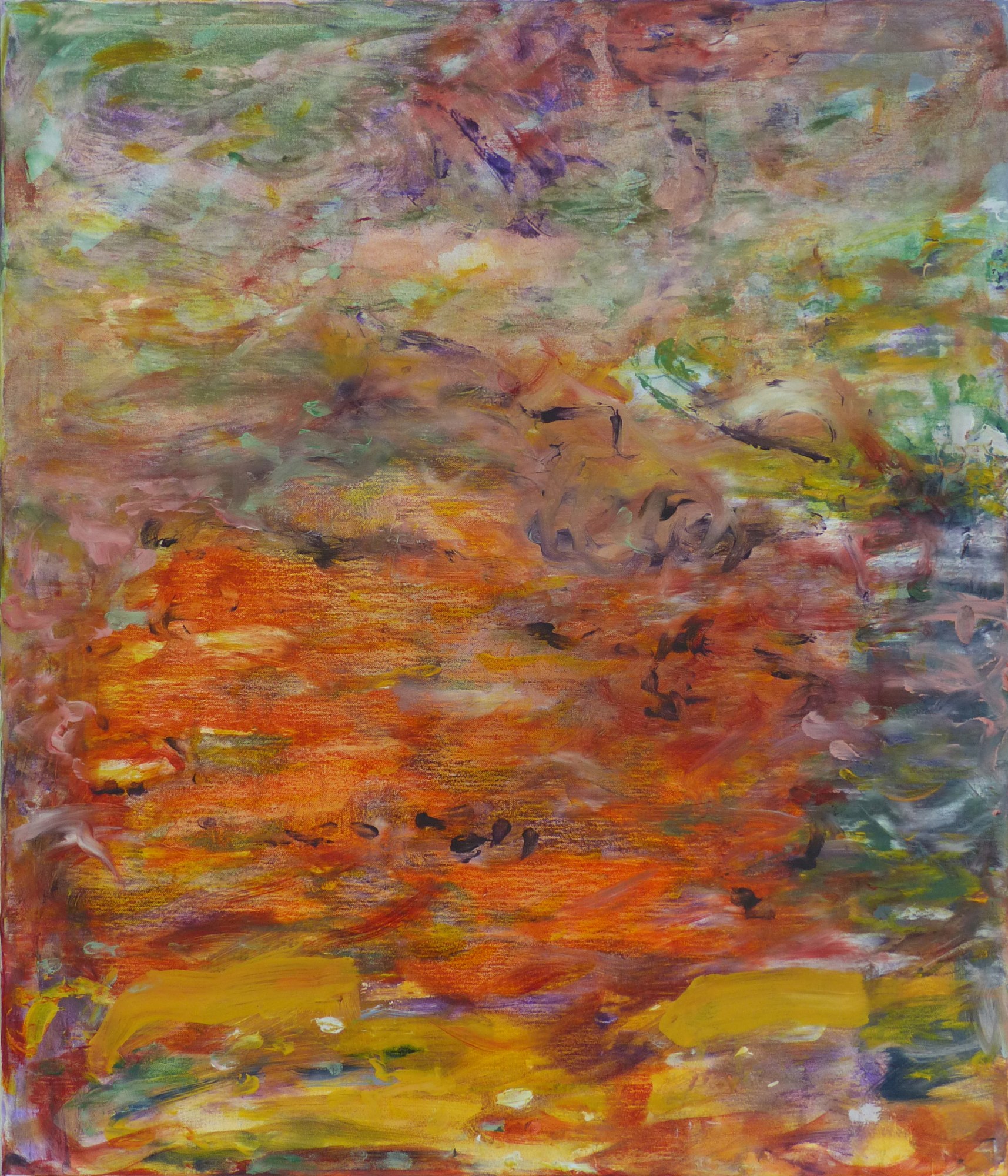 semi abstract impressionist landscape of bogland. Oranges, brown and greens mixing with strong graphic brushstrokes.