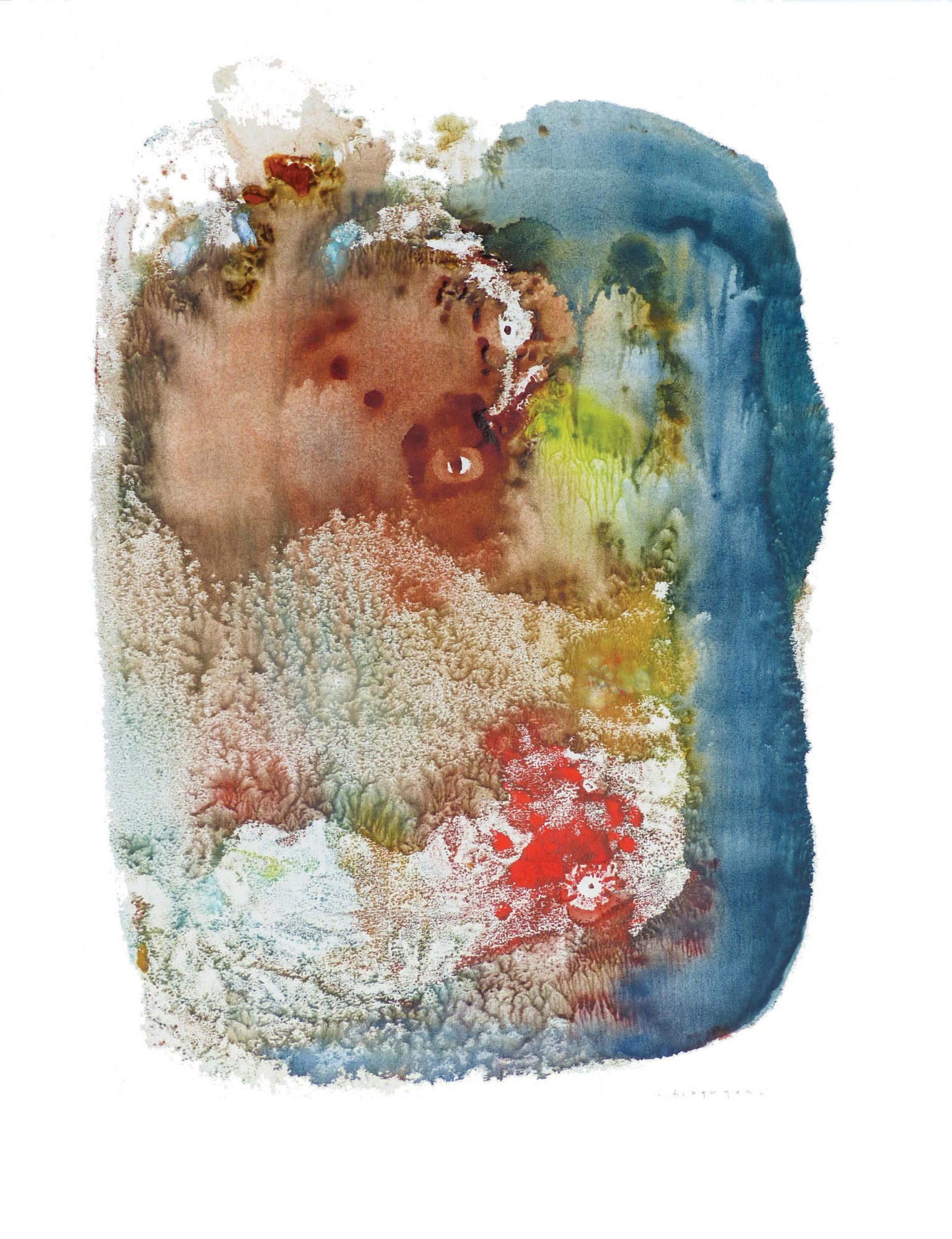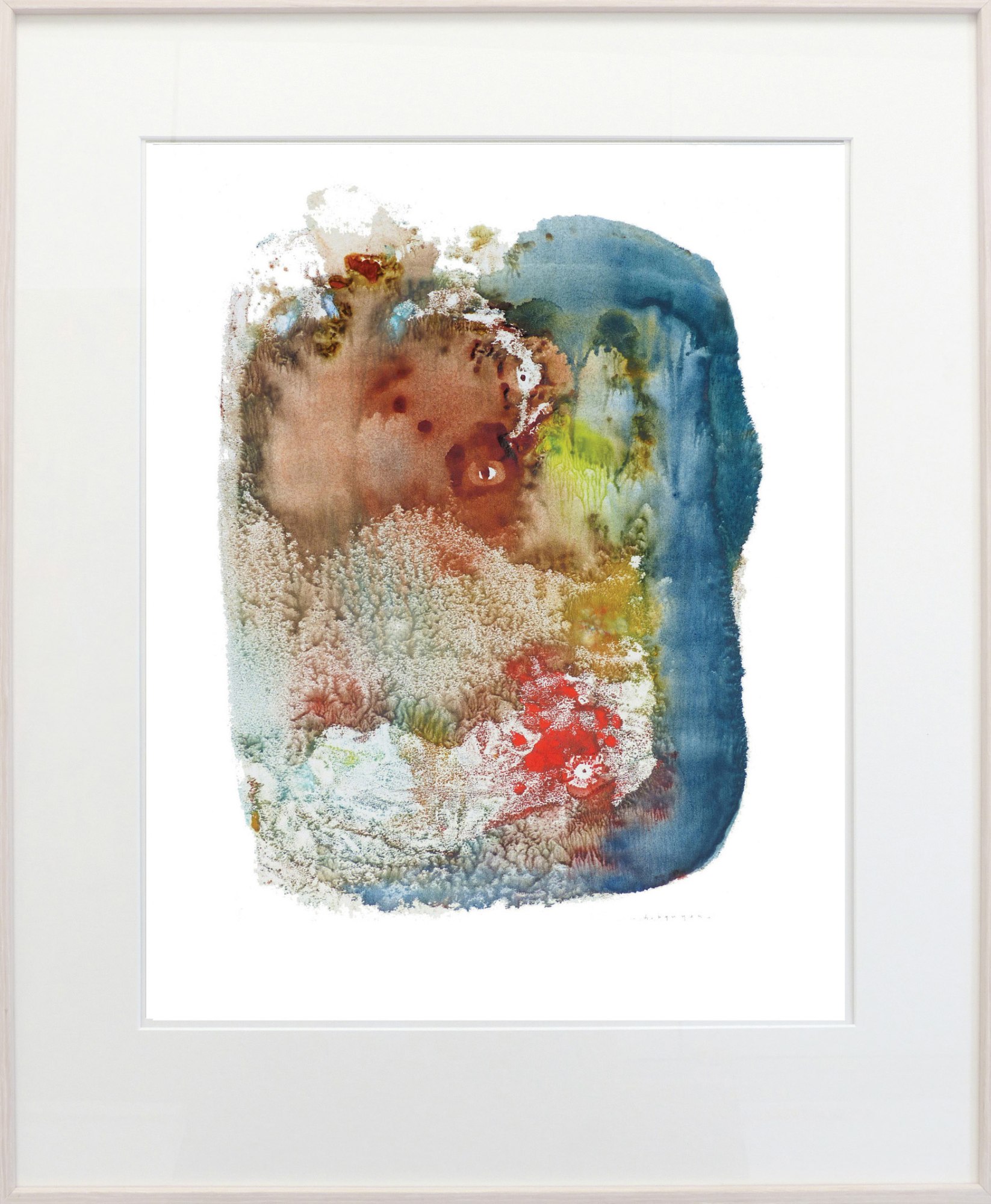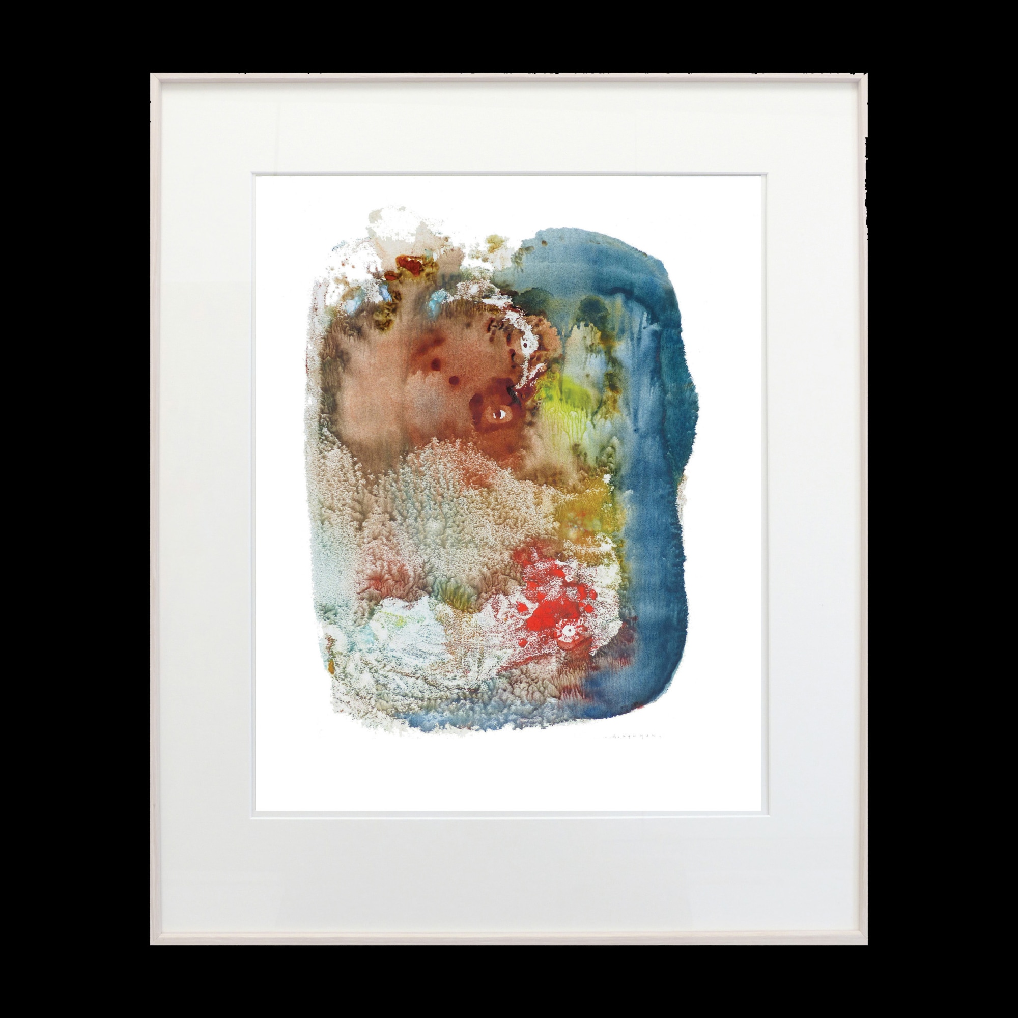 Monotype printed on 165gm Cream Laid rag paper. Mounted on board. Original, signed and framed with a thin hardwood white lime molding and glass.