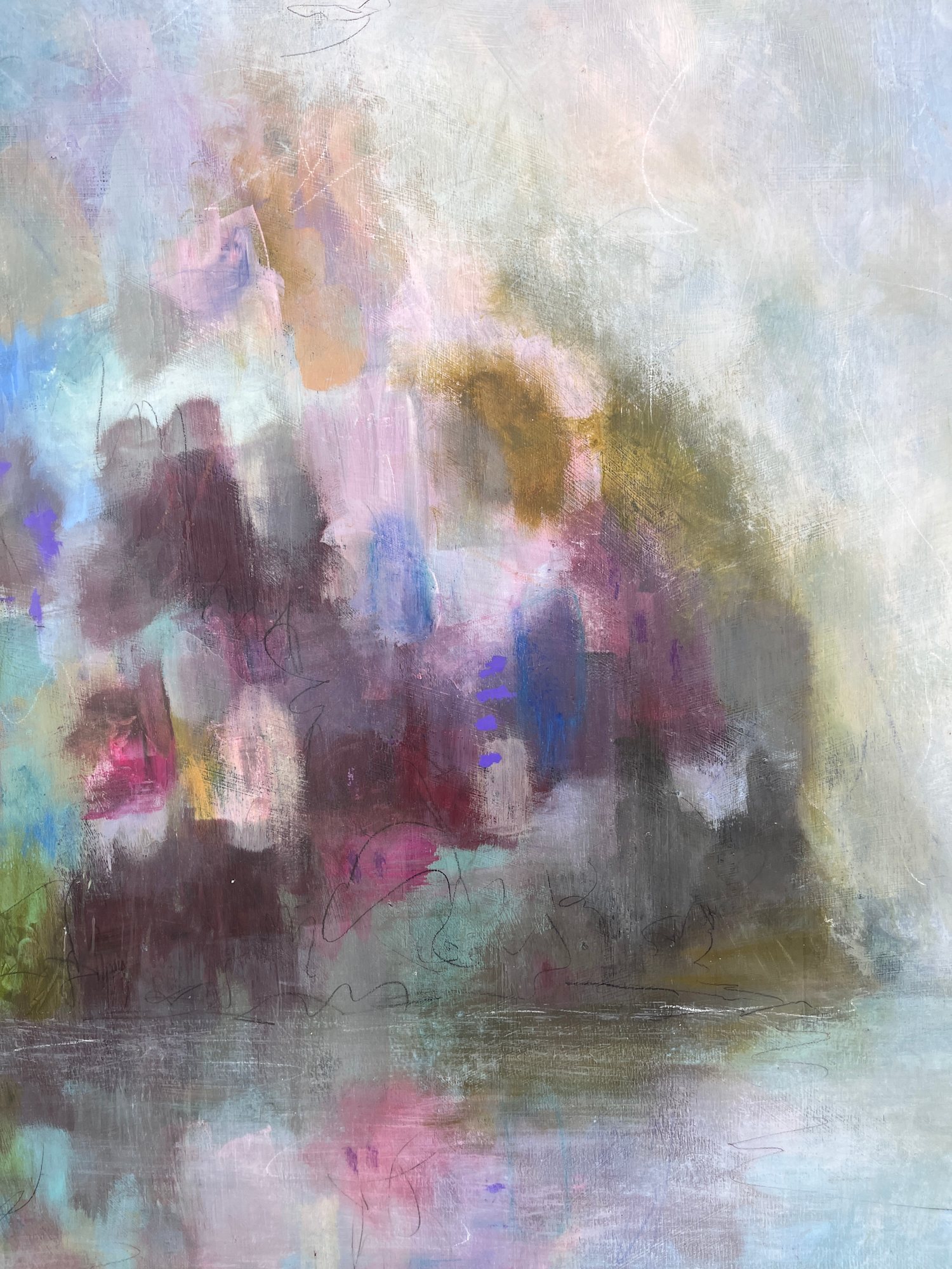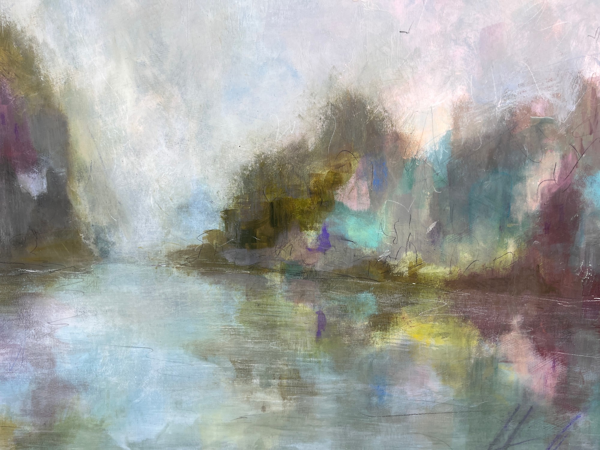 Mixed Media : Encaustic Wax, Acrylic, Oil on Wood, Solid Oak Frame