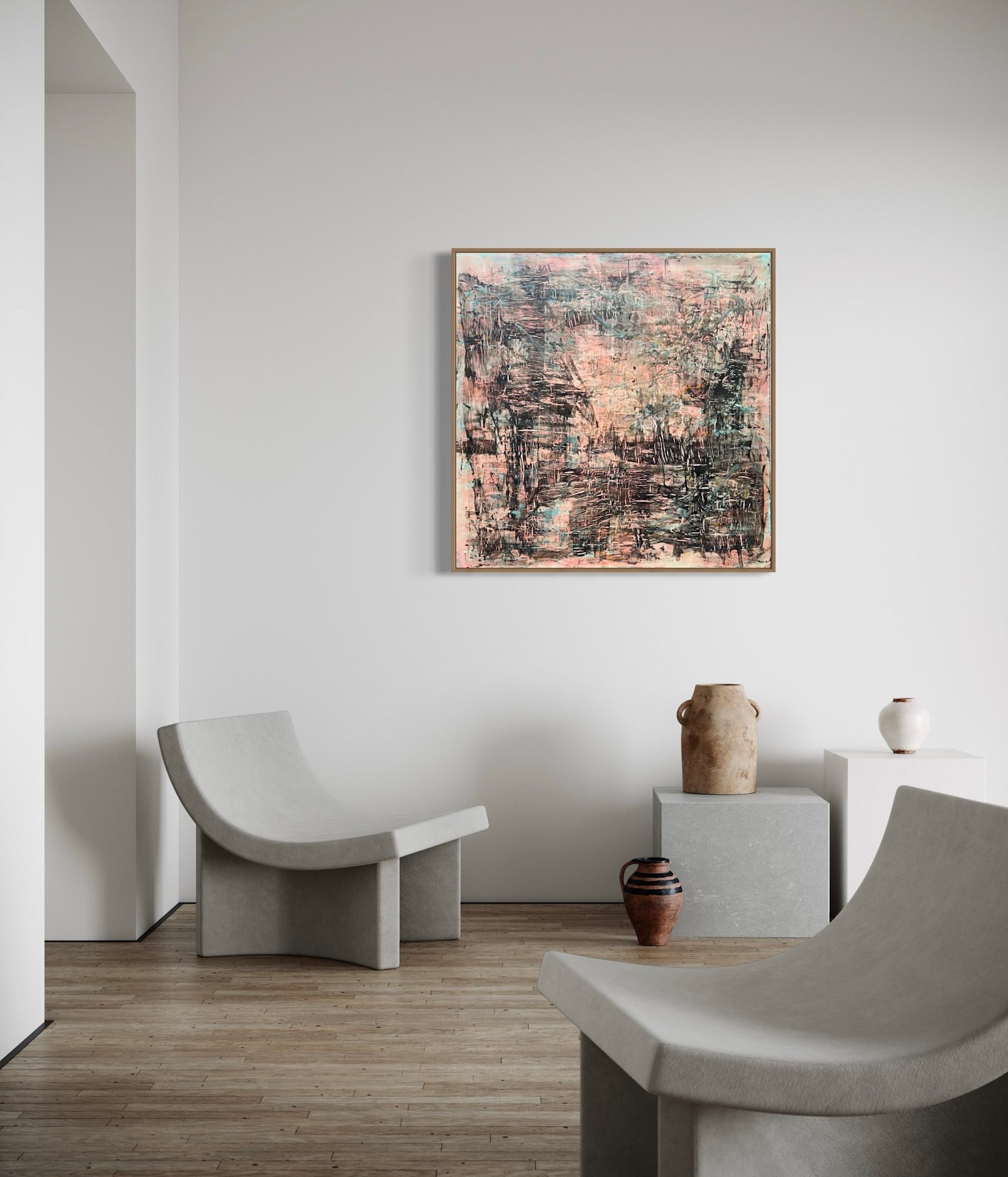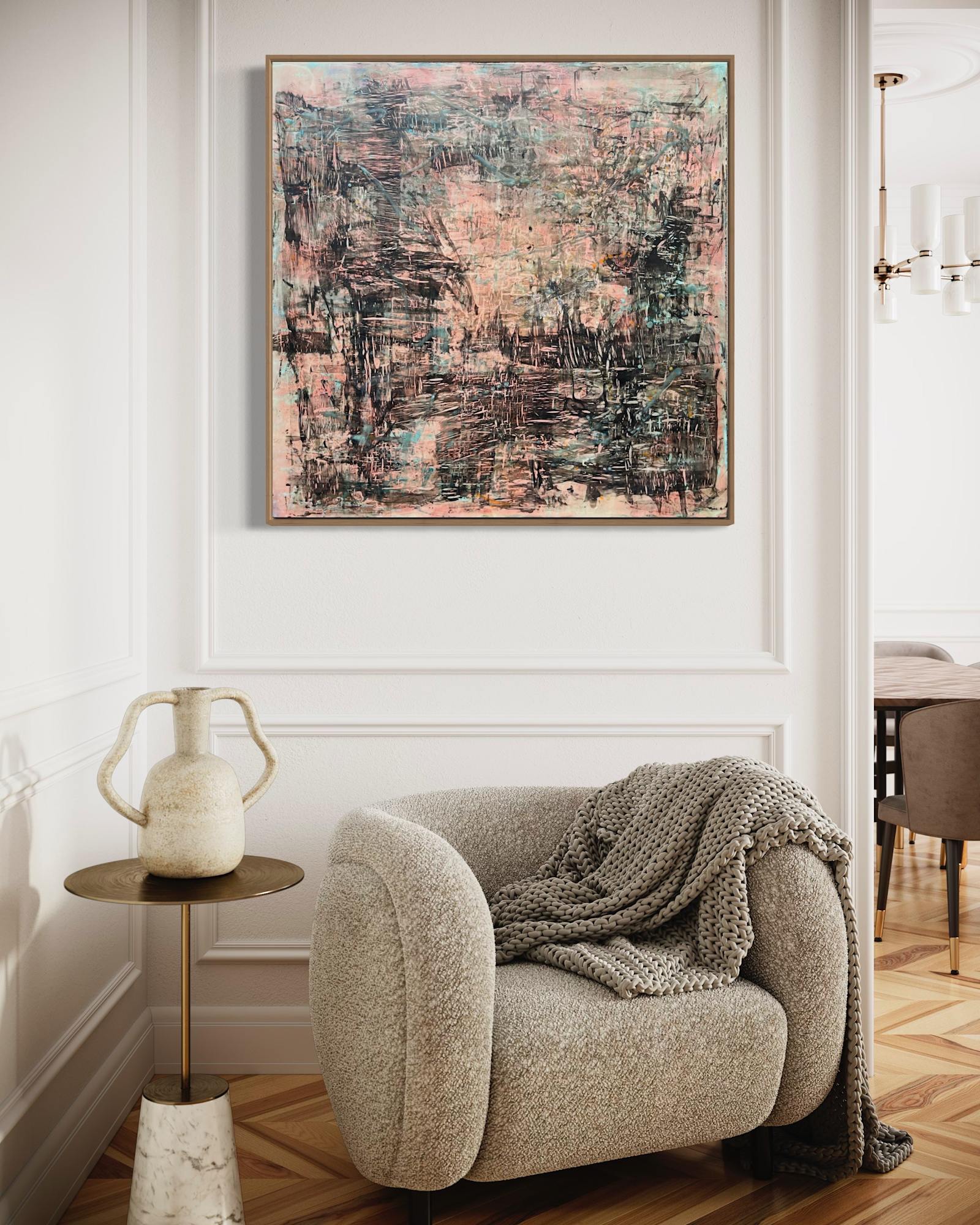 Mixed Media : Encaustic Wax, Acrylic, Oil, Leaf, Transfer on Wood, Solid Oak Frame
