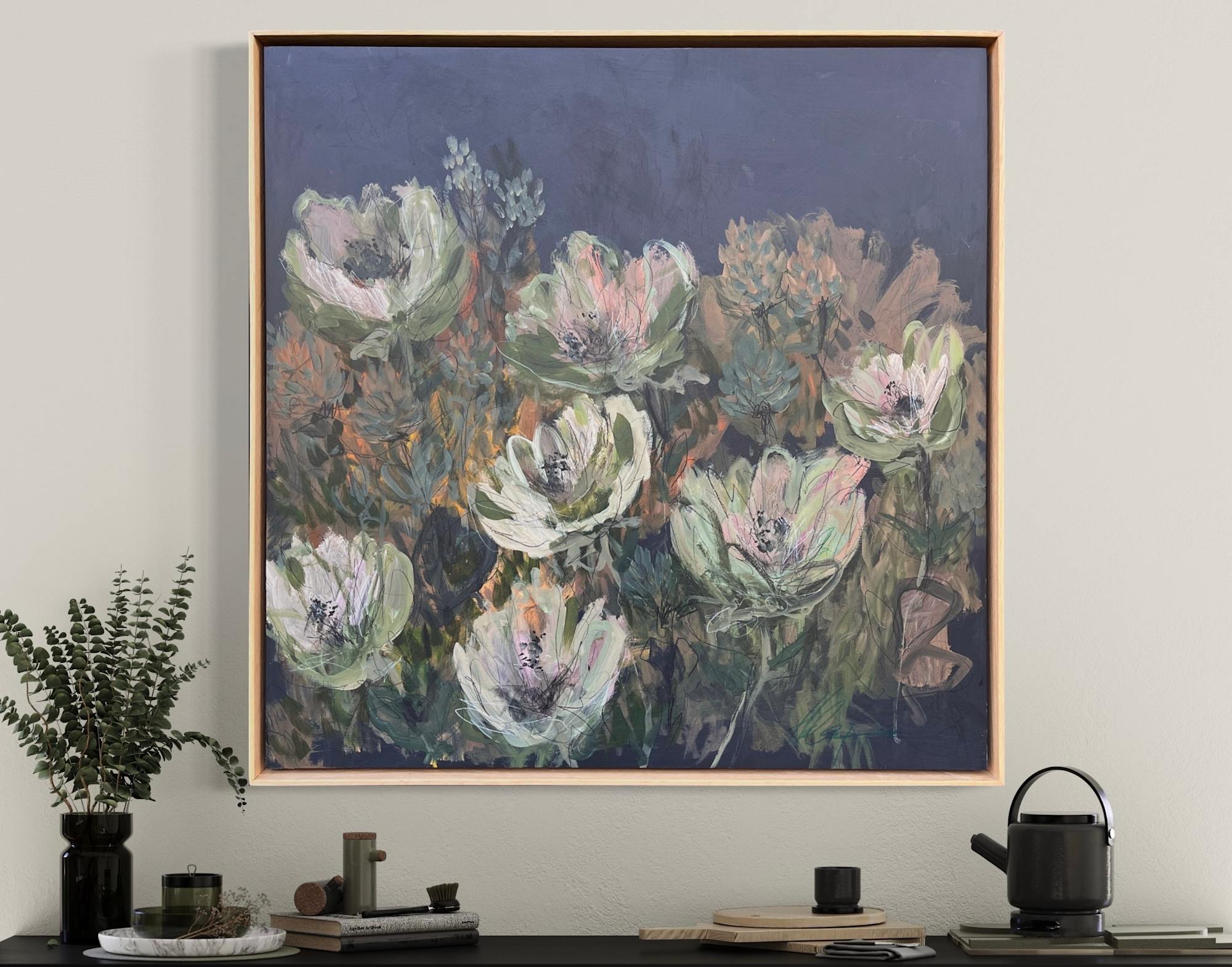 Mixed Media : Encaustic Wax, Acrylic on Wood, Solid Oak Frame