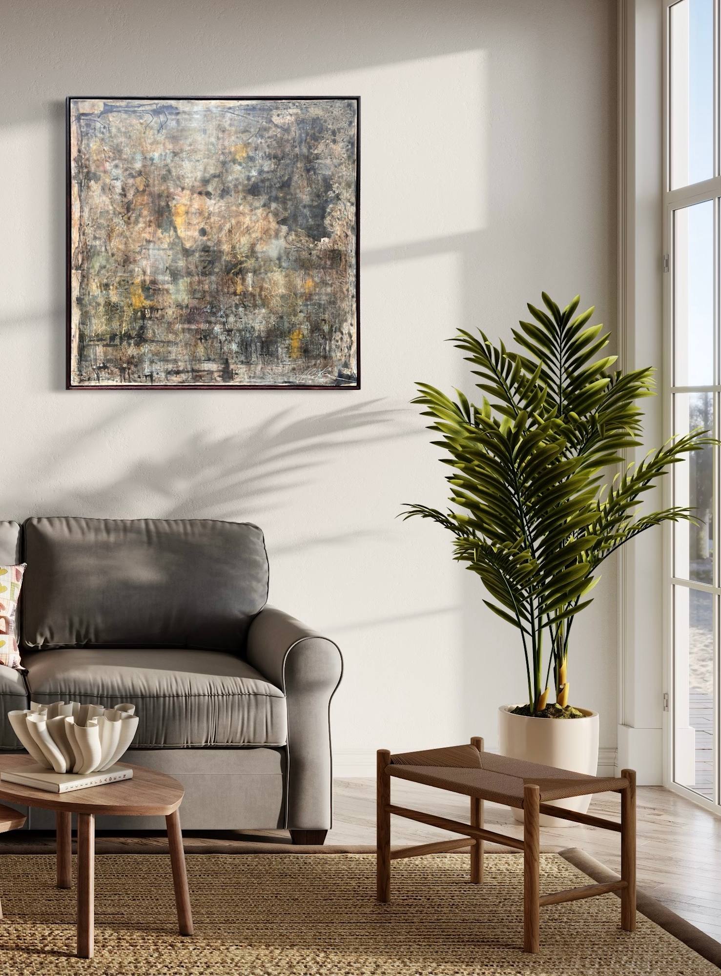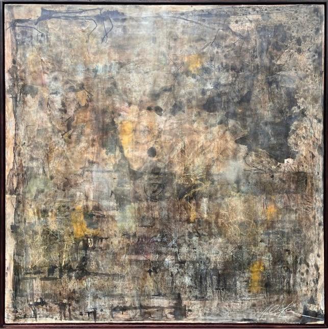 Mixed Media : Encaustic Wax , Acrylic, Oil, Ink, Harakeke, Collage, Ash on Wood, Solid Oak Frame